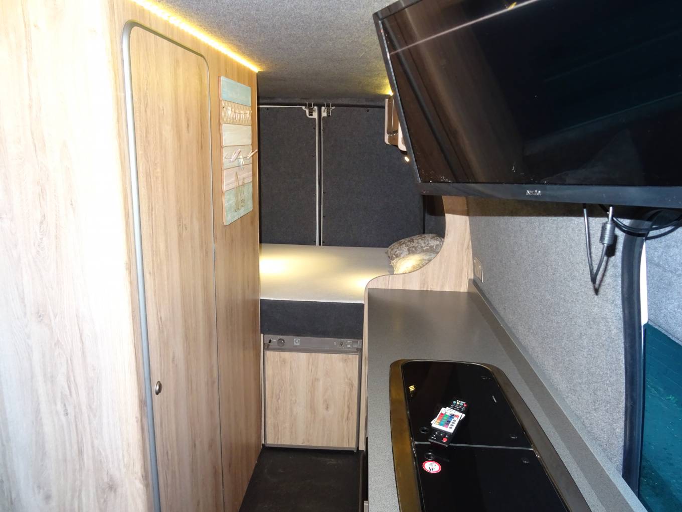 Foldaway table, steps, pop up awning, hock up cable included. 19'' TV with swivel bracket.