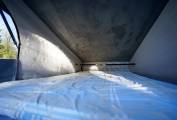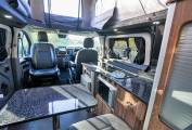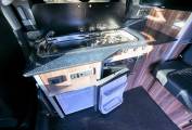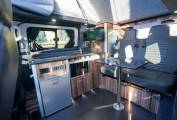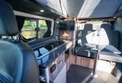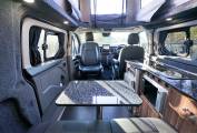 In the well finished habitation area, you will find a kitchenette fully equipped with a fridge, two gas burner hobs, Microwave, cold-water sink with 40 litre Fresh water container and a removable pedestal table. You will also find storage cupboards, 240v plug sockets with USB charging points and the camper is also fitted with LED lighting. Plus the all important diesel heater for those coller evenings.