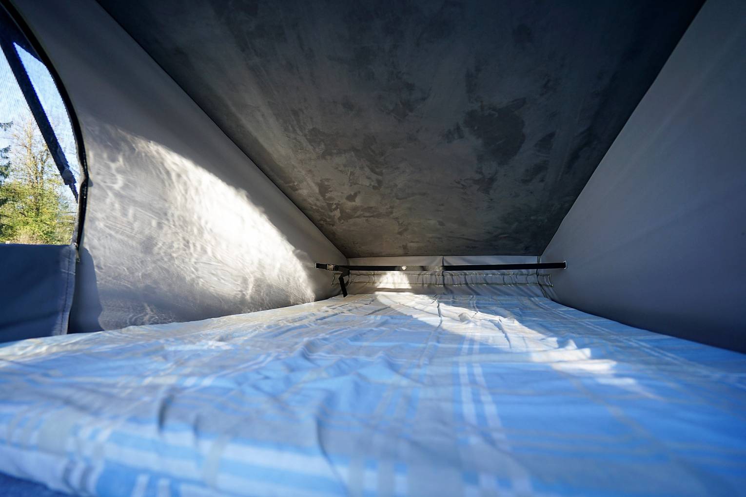 upper double bed is raised. The canvas pop top roof features zipped windows to allow