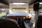 The extendable electric drop-down bed is positioned above and allows you to sleep both lengthways and widthways across the motorhome.