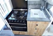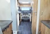 We enter the motorhome on the drivers side via an electric step immediately opposite is a large wardrobe with fixings for the occasional table below. The Kitchen area immediately to the left consists of a Full size Dometic oven & hob. It has four burners, 3 gas & one electric for when you are plugged in to the mains on site. To the right is a good sized oblong sink with chrome mixer tap that extends as a rinsing aid. There are plenty of cupboards and drawers for all your cooking utensils. Opposite is a large absorber style Dometic fridge with separate freezer compartment, this can be operated in fully automatic mode so will switch between Gas; 12v and 240v depending on whether you are wild camping or plugged in on site. Above the fridge is a full size Kenwood microwave combination oven & grill.