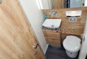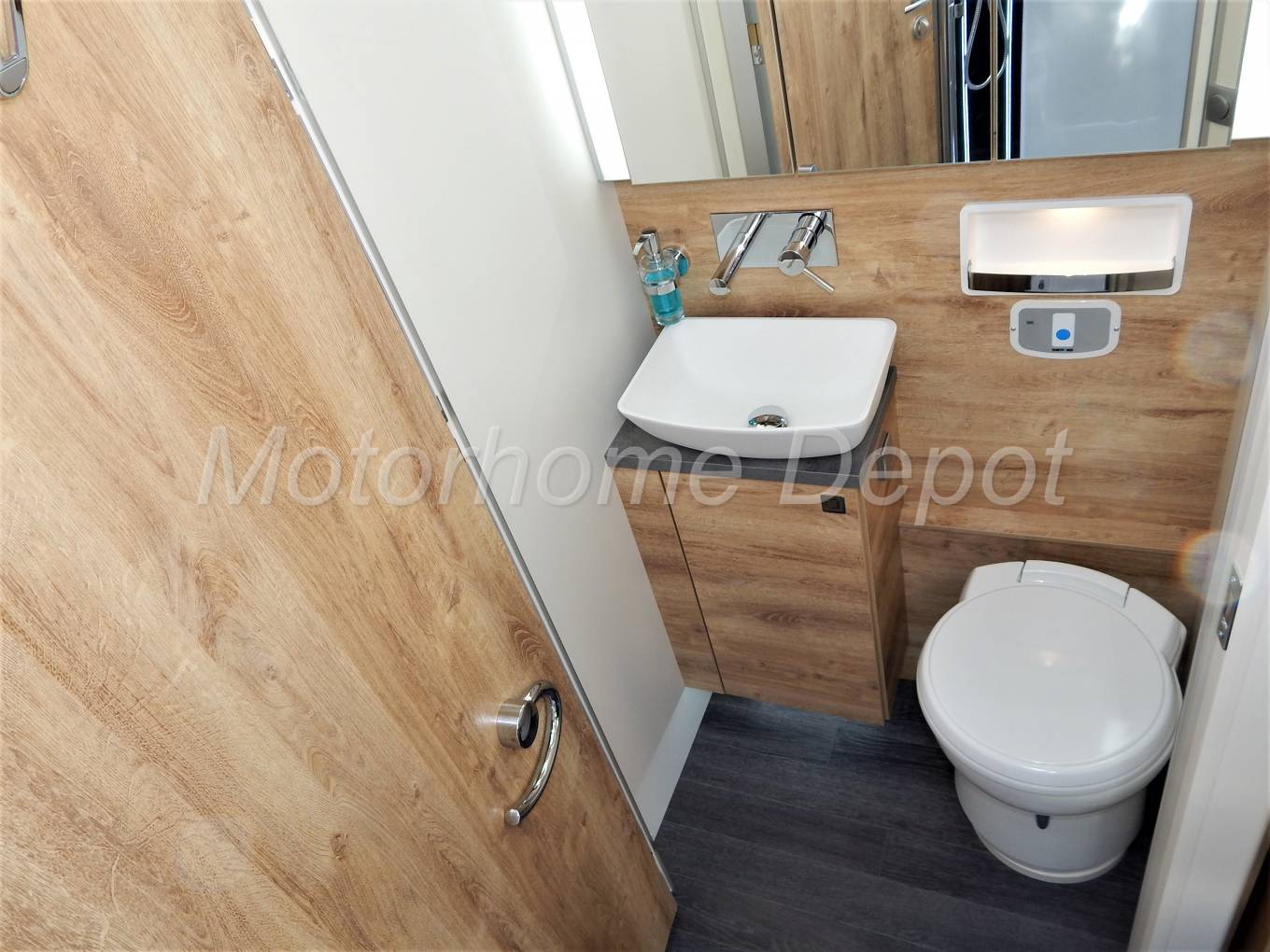 Moving Forward is the bathroom area with a good sized shower to the right and Toilette & sink opposite. Both are well lit and have a good feeling of space. They have a contemporary feel with a pedestal style wash hand basin with flush fitting chrome mixer tap above. The toilette is a Thetford Fresh water flush with a swivel top. There is a door that closes off to the rear and a sliding door to the front so you can make a very private area to get ready in the morning.