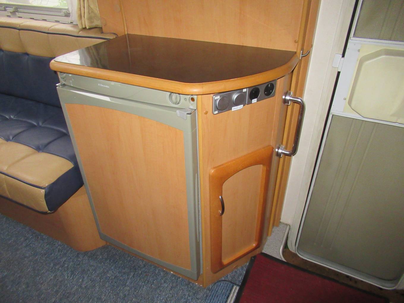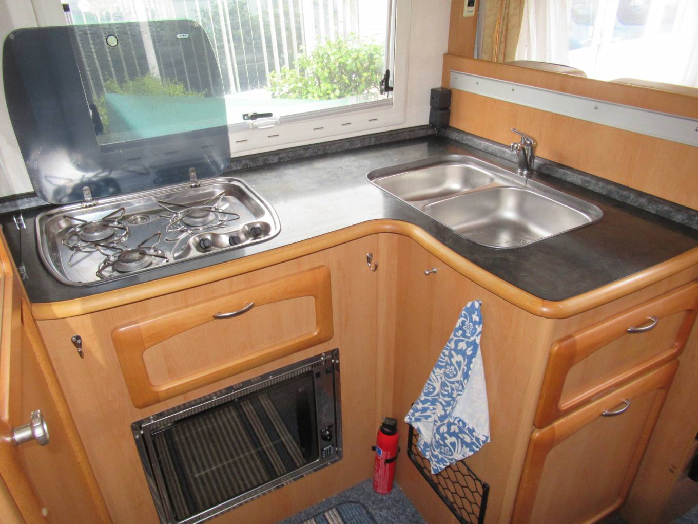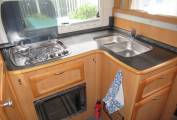In the centre of the vehicle is the very spacious Kitchen Area featuring a 3 burner hob, extractor hood, Electrolux 3 way fridge freezer and a double sink with integrated chopping boards / work shelves and ample cupboard and worktop space.
