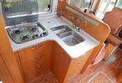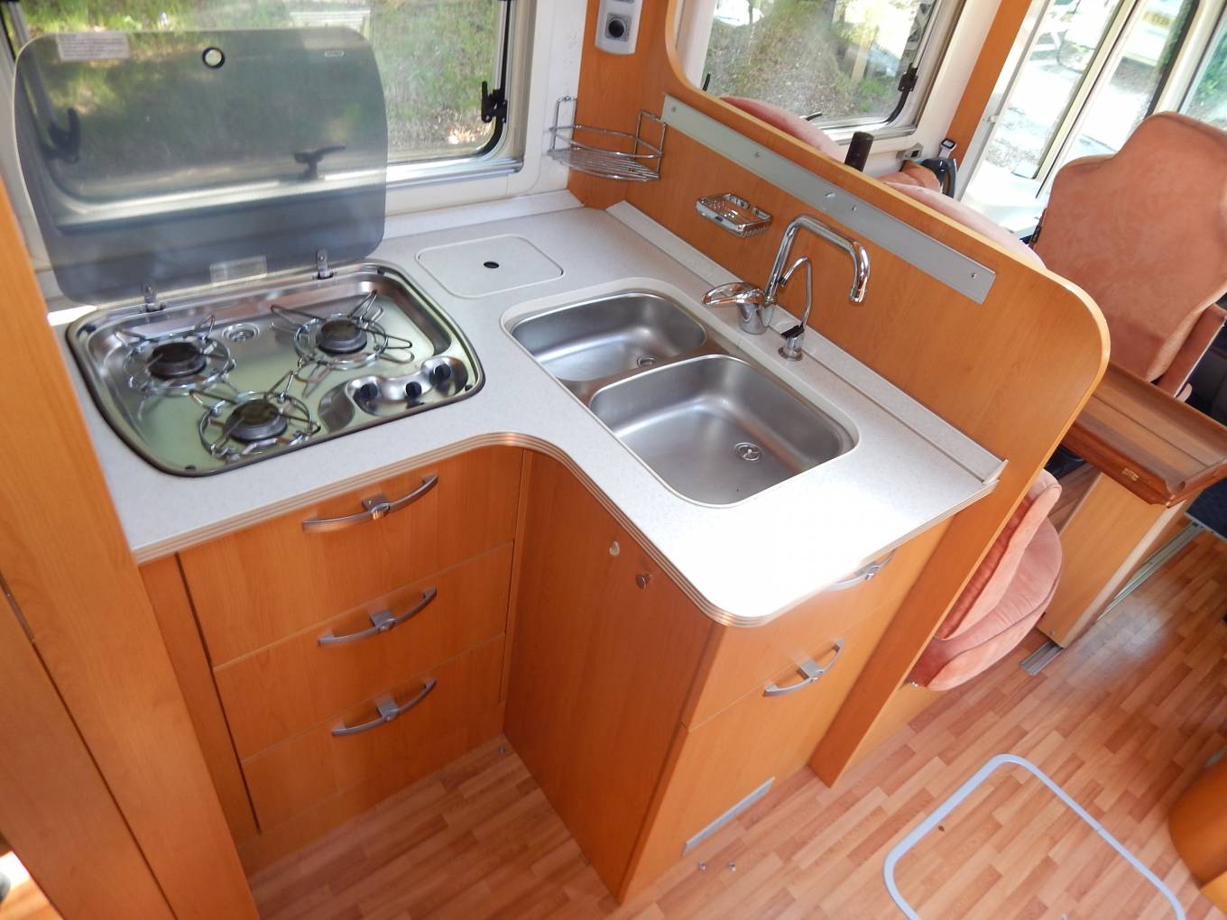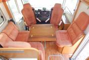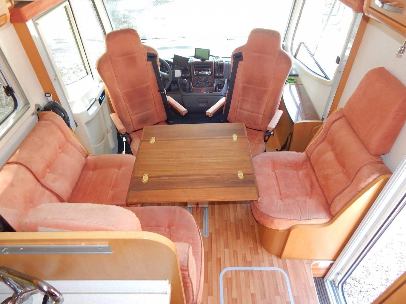 - Using the electric step to enter and the lounge / dining area is to your right, with an L-shaped sofa that has two forward facing seats with seatbelts, on the offside is a single side seat and the two front seats swivel to face the teak dining table with folding sides, which can be removed if required. A large sunroof floods the lounge with plenty of natural daylight, upper aircraft style cabinets and under seat storage available.