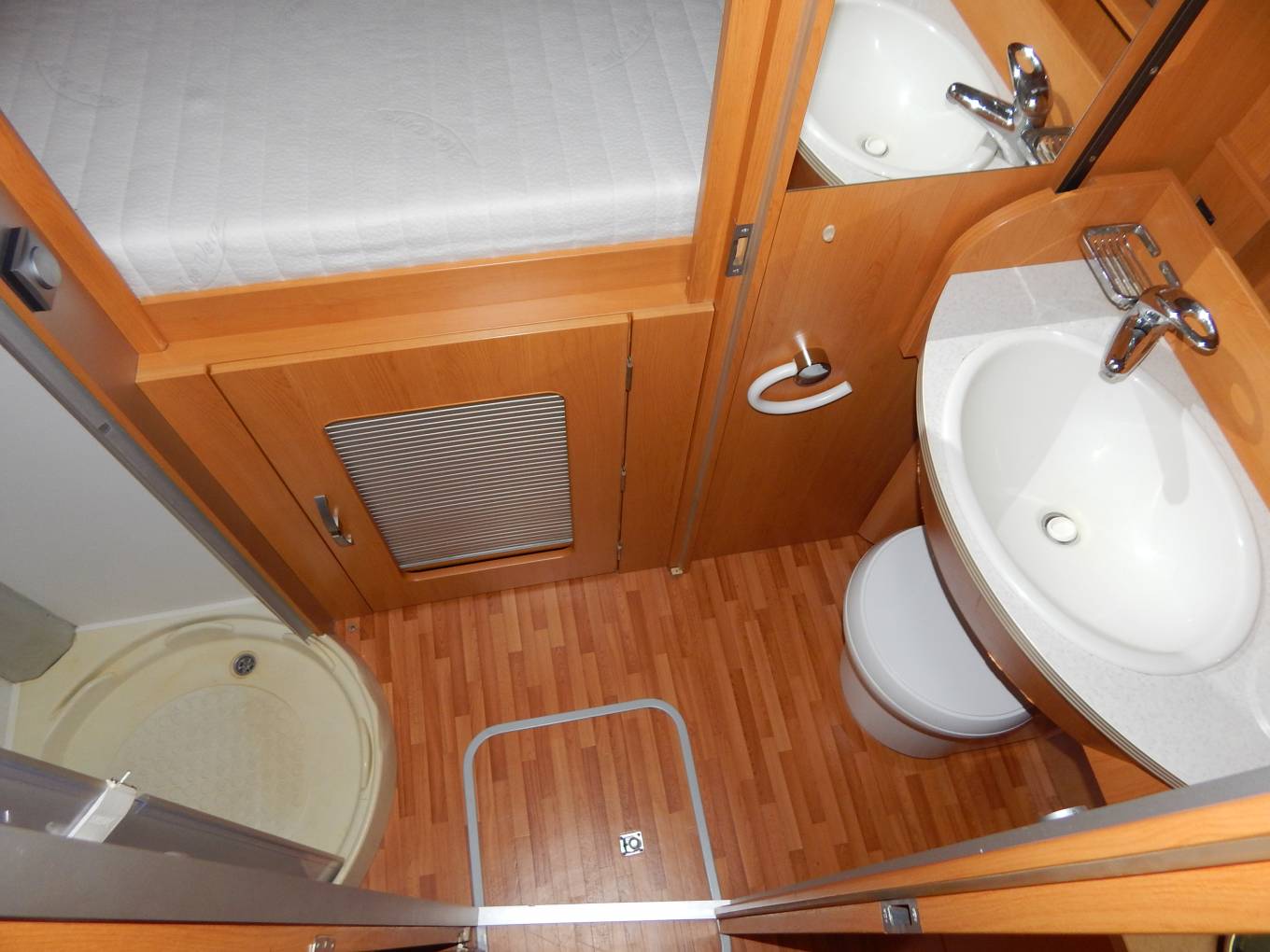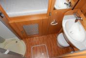 - The washroom area has a clever door system that swings out to section off the area from the front of the motorhome creating an en-suite to the main bedroom. On the nearside you have a large washbasin with chrome mixer tap, which raises up to reveal the Thetford cassette swivelling toilet with electric flush. On the off-side is the separate shower cubicle with revolving perspex shower door.