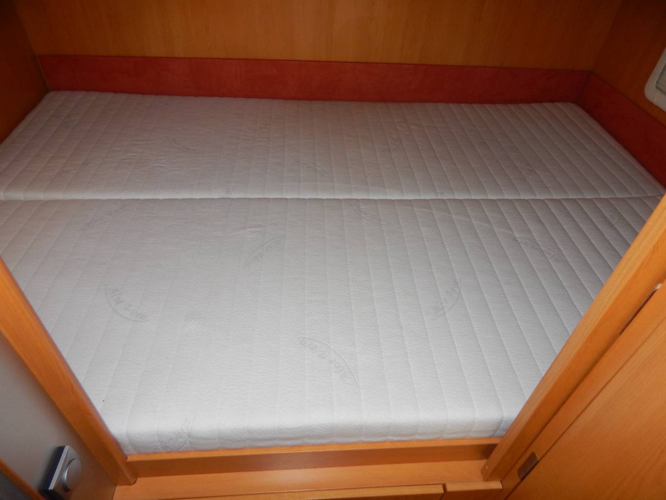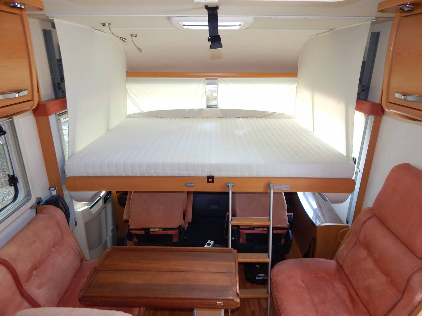- The electric drop-down over cab bed is spacious with privacy curtains, reading lights and a wooden ladder gives access.