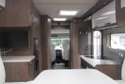 Superb Spec including: Large Rear Garage, Full Leather Upholstery, Mave Automated Levelling System, Gaslow System, Solar Panel, Windout Awning, Max View Sat Dish, Sat Nav, Reversing Camera, Tracker, 3 x Leisure Batteries, Tow Bar, Alarm, Blinds / Flyscreens, Cruise Control, Cab Blinds, ALDE Heating System, Electric Step, Spare Wheel, DAB Radio, 2 x Avtex TV's, Swivel Cab Seats, BBQ Point, 2 x Travelling Seat Belts. More than Ample Storage Throughout.
