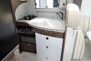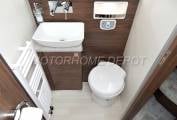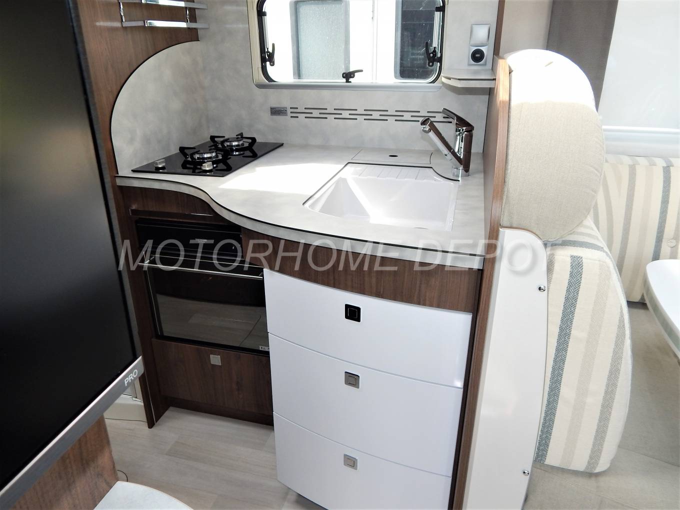 Moving rear the galley style Kitchen which consists of a good sized sink & drainer with chrome mixer tap that extends as a rinsing aid, behind the sink is a small inset waste bin & there is a clever work surface extension which uses the sink cover to make it up. There is a 2 Gas burner hob & below a full size Thetford Oven & Grill. There is plenty of cupboard & drawer space above & below for all your cooking utensils. On the opposite side is a large Dometic absorber fridge with separate freezer compartment, this is fully automatic so will switch between Gas; 12v and 240v depending on whether you are wild camping or plugged in on site. Above the fridge you will find an added 240v socket if you wish to carry a microwave and the satellite tv power unit.