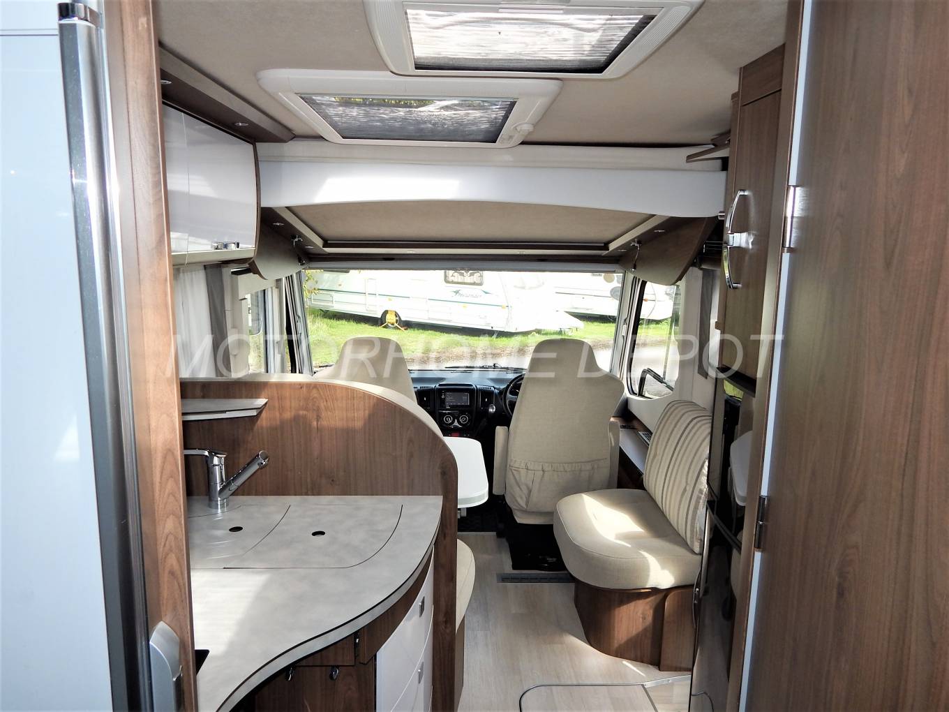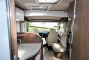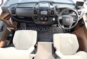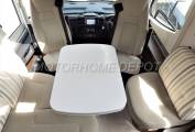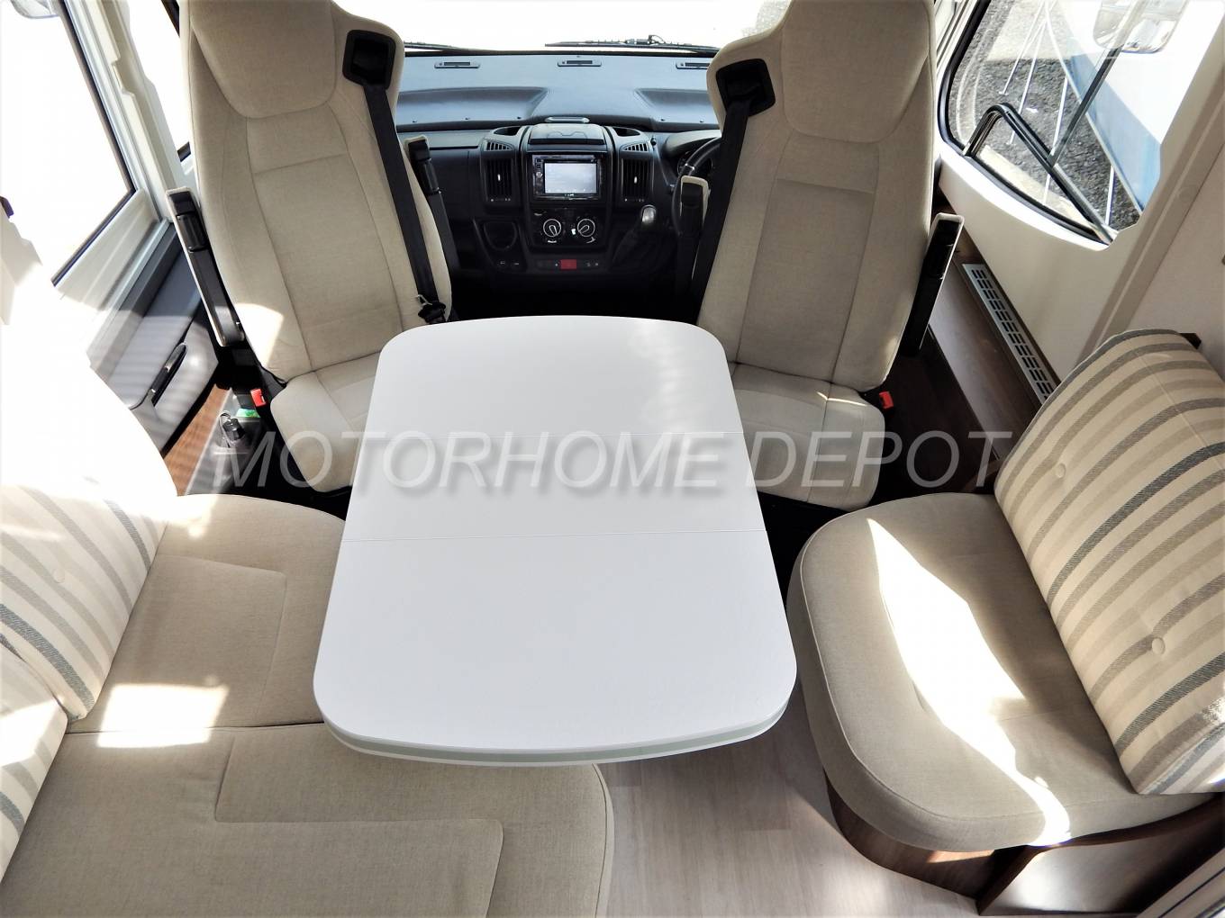 We enter the motorhome on the drivers side via an electric step immediately to the right is the lounge area which consists of a small sofa next to the habitation door, opposite an L shaped sofa with 2 forward facing seats with lap & diagonal 3 point seat belts for travelling passengers. The front two seats rotate to join this area so you could easily seat 6 people if entertaining on site. The table has a clever extending feature so it can be reduced in size for travelling. Above this area is the second large double bed that is the full width of the vehicle, it lowers electrically in place and can be hopped into via the small sofa.