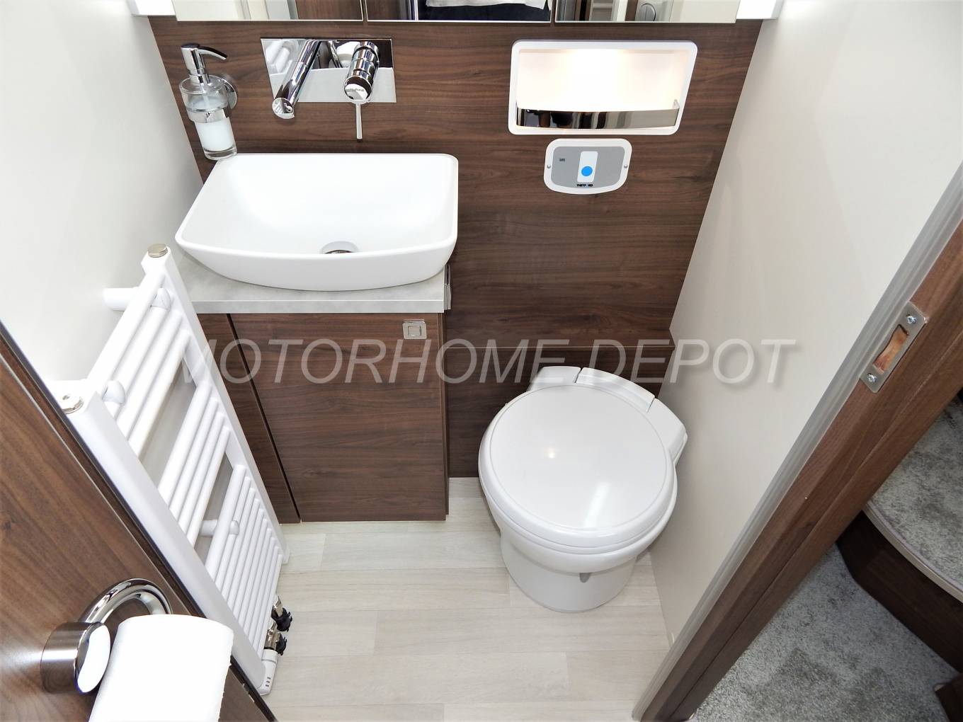Moving rear is the bathroom area covering the middle of the motorhome, with a good sized shower compartment on the passenger side that has the benefit of glass doors to close. Opposite is a Thetford fresh water flush toilet with swivel head that is finished in ceramic with modern sink & chrome mixer tap above. There is plenty of cupboard space with mirror fronts that are well lit to give a good feeling of space. The bathroom area can be closed off front to rear with the use of solid doors that make a perfectly private area for dressing in the morning.