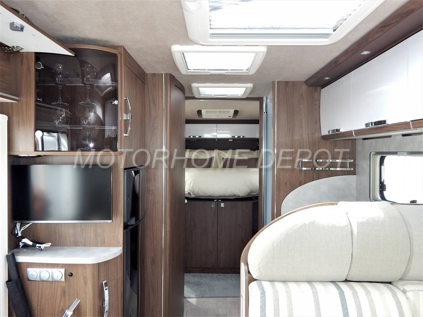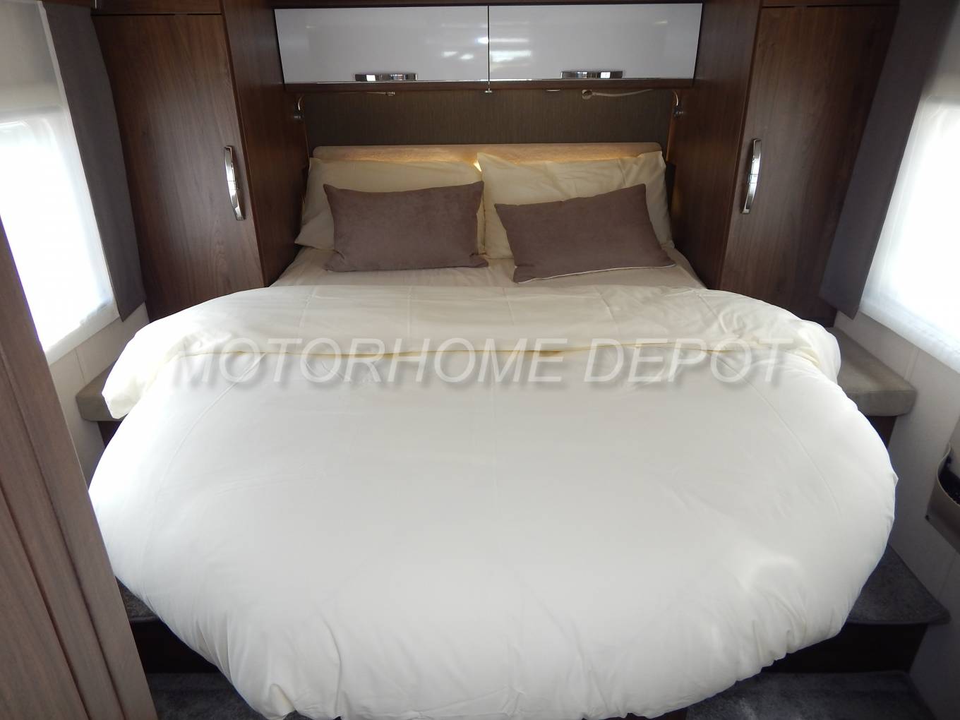 To the rear is the main bedroom with a large island bed, this can be reclined electrically during the day for extra space and to allow reading in bed, at night it extends to its maximum extension or night mode. Either side of the bed are his & hers wardrobes with extending hanging rail and interior lighting.