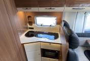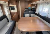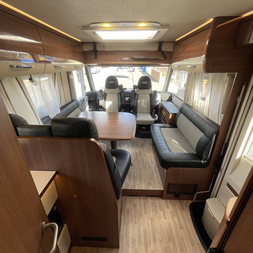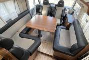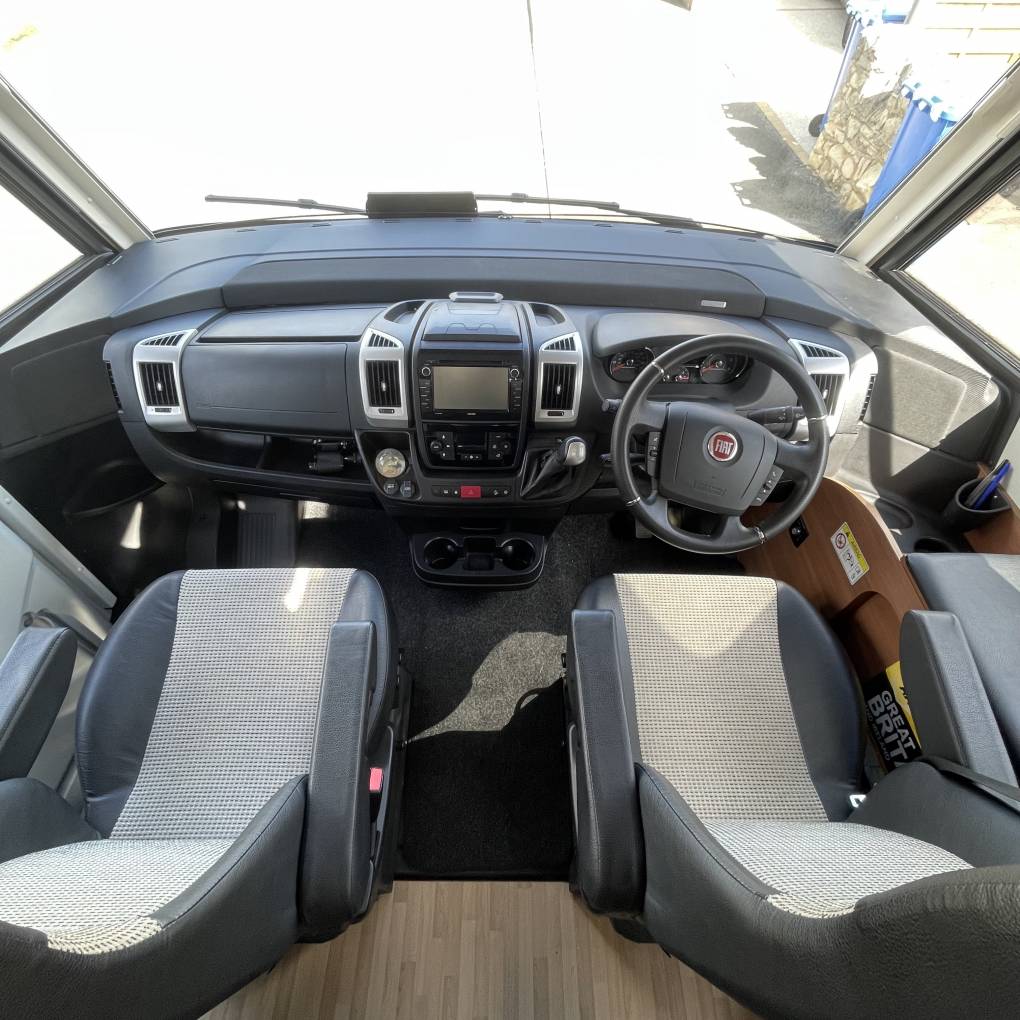You have a spacious dinette behind cab including driver and passenger swivel seats. Leather trim upholstery. Over cab pull down double bed. Large rear bathroom with sink, cassette toilet and shower cubicle. Side kitchen including three gas hobs, sink, large fridge, freezer and oven. Plus many other fantastic extras such as reverse camera, bike rack and solar panel.