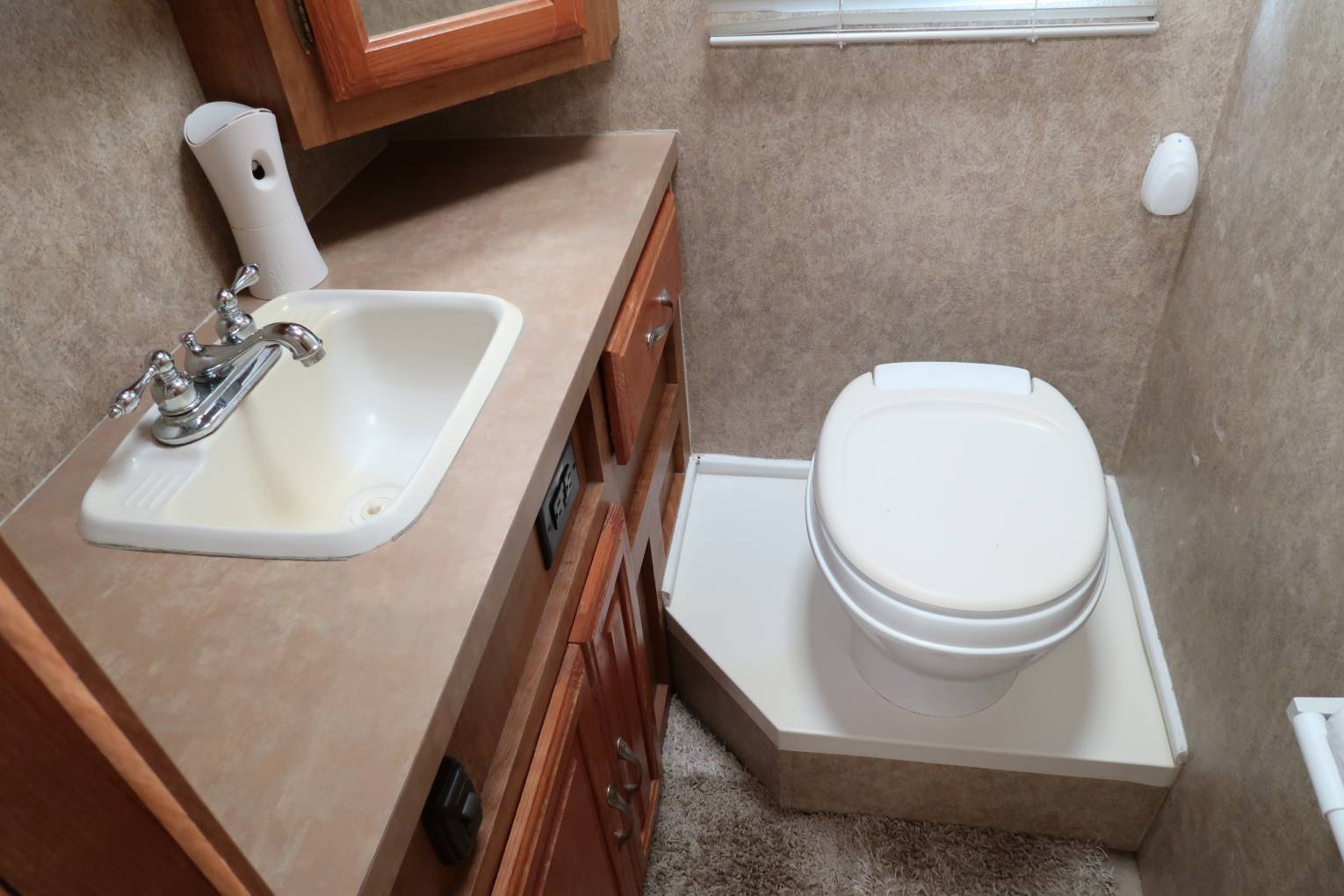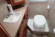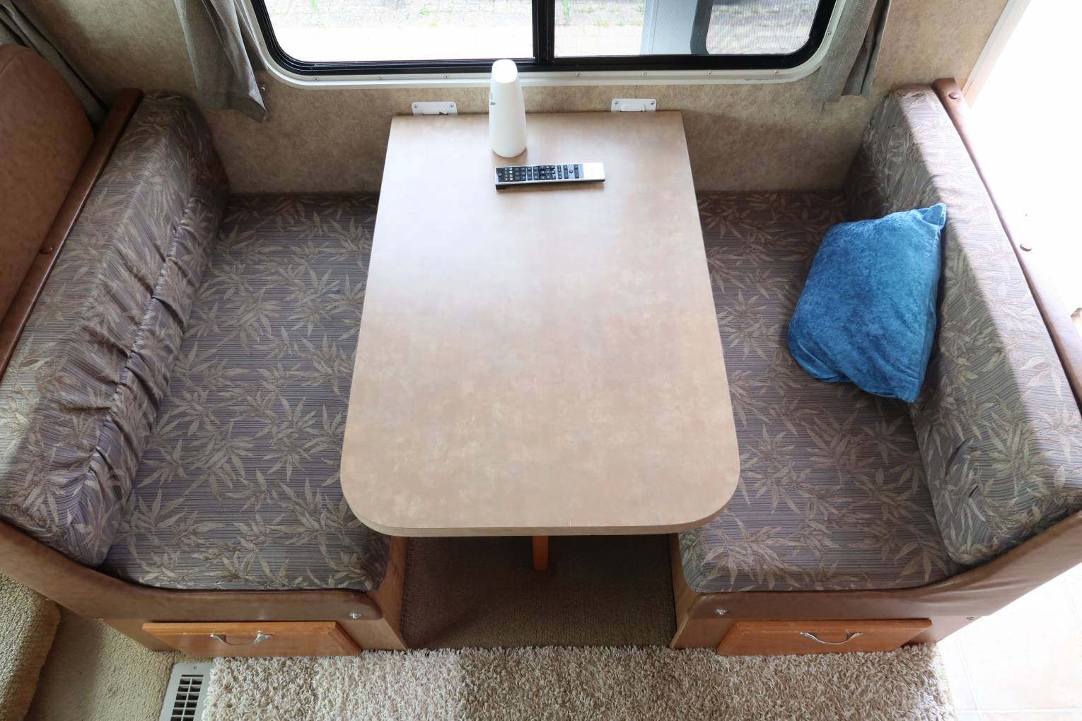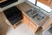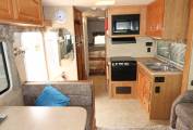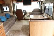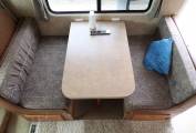In the middle of the RV is the L shape kitchen featuring an oven and grill, a 3 gas burner hob, a microwave, a sink with mixer tap, plenty of cupboard and drawer space for your utensils and ingredients and a reasonable amount of counter top work space to prepare your food. Then towards the front is the spacious lounge with a 2 seater side facing sofa as well as rear and forward facing seater sofas. Here you have a large solid dining table so that you can enjoy your meals in spacious comfort, and after you have dined relax back into the sofas and watch some TV on the large screen above the cab.
