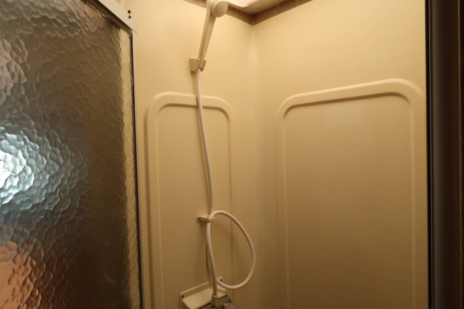 At the rear is the bedroom which has a large transverse bed and a huge amount of wardrobe space for your clothes. There are 2 windows throwing in loads of daylight so this is a nice and airy bedroom. As you move forwards you have on the right hand side a large separate shower with a screen and on the opposite side is the washroom which has a toilet, a wash basin with mixer tap, 2 mirrored storage cupboards as well as additional storage space. The washroom also has a skylight and a window.