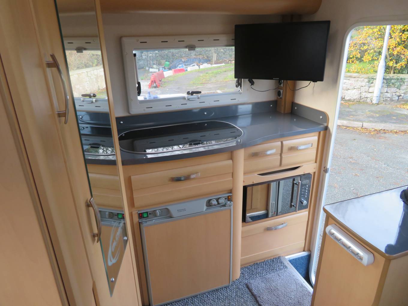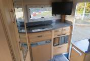 A truly surprising 2 berth, providing a spacious interior comprising two small side-facing sofas that convert to two singles or a large double bed a very well appointed rear kitchen and a rear washroom. The layout is completed by a large over cab storage locker with two opening doors. this little gem is a close to a new motorhome as it can be.