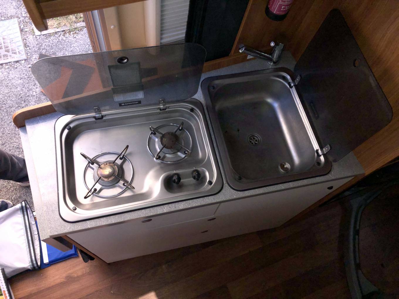 Firstly, we enter through the habitation door and facing us is the dinette which seats 4 comfortably and converts to a single bed. Opposite is the well equipped kitchen. Which contains a gas hob, grill, oven, 3 way fridge and wash basin. As we move to the rear you will find the wash room with a large wardrobe, shower, toilet and hand wash basin. Finally, at the rear is large comfortable double bed. The bed folds up to create a large storage space.