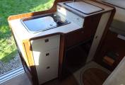 Kitchen has two burner gas hob, sink, fridge and lots of storage drawers and lockers.