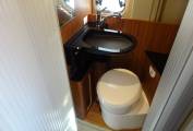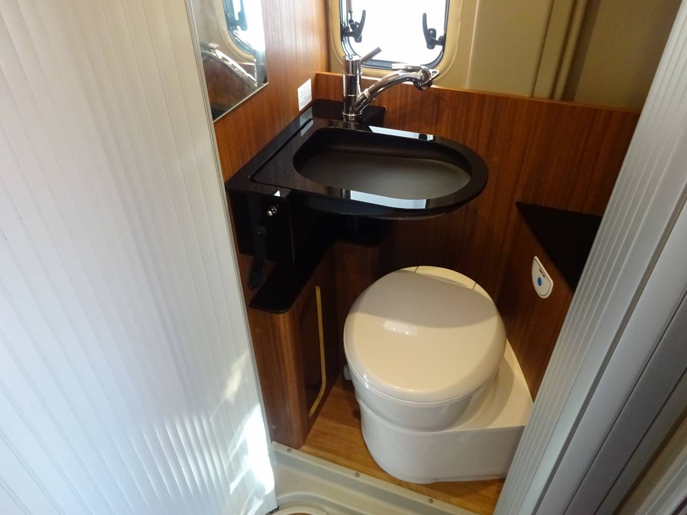 Central washroom with a full size shower enclosure, cassette toilet and folding basin.