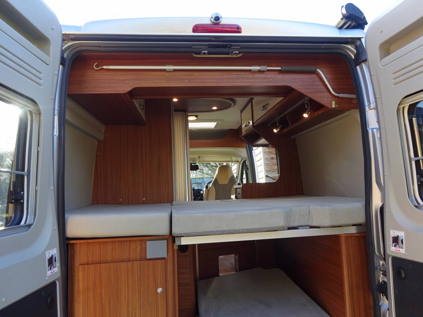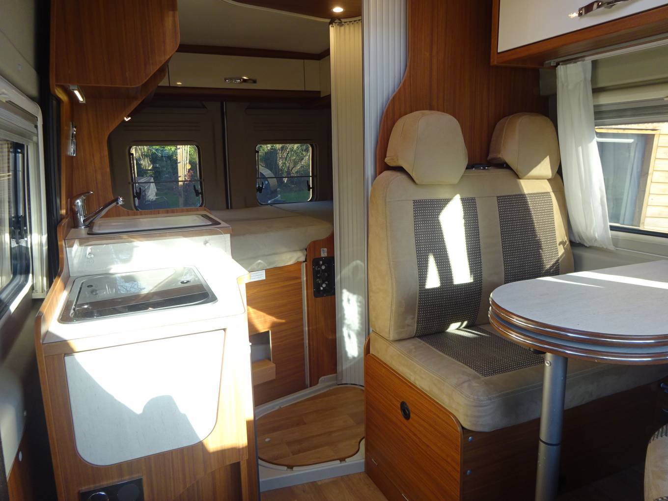 Rear fixed double bed over a large storage area, Mid kitchen and washroom with front diner and swivel cab seats.
