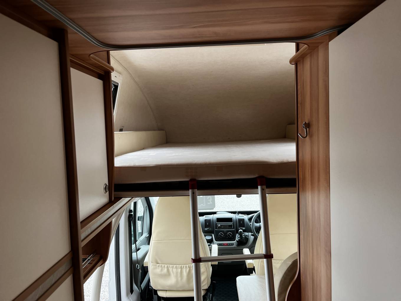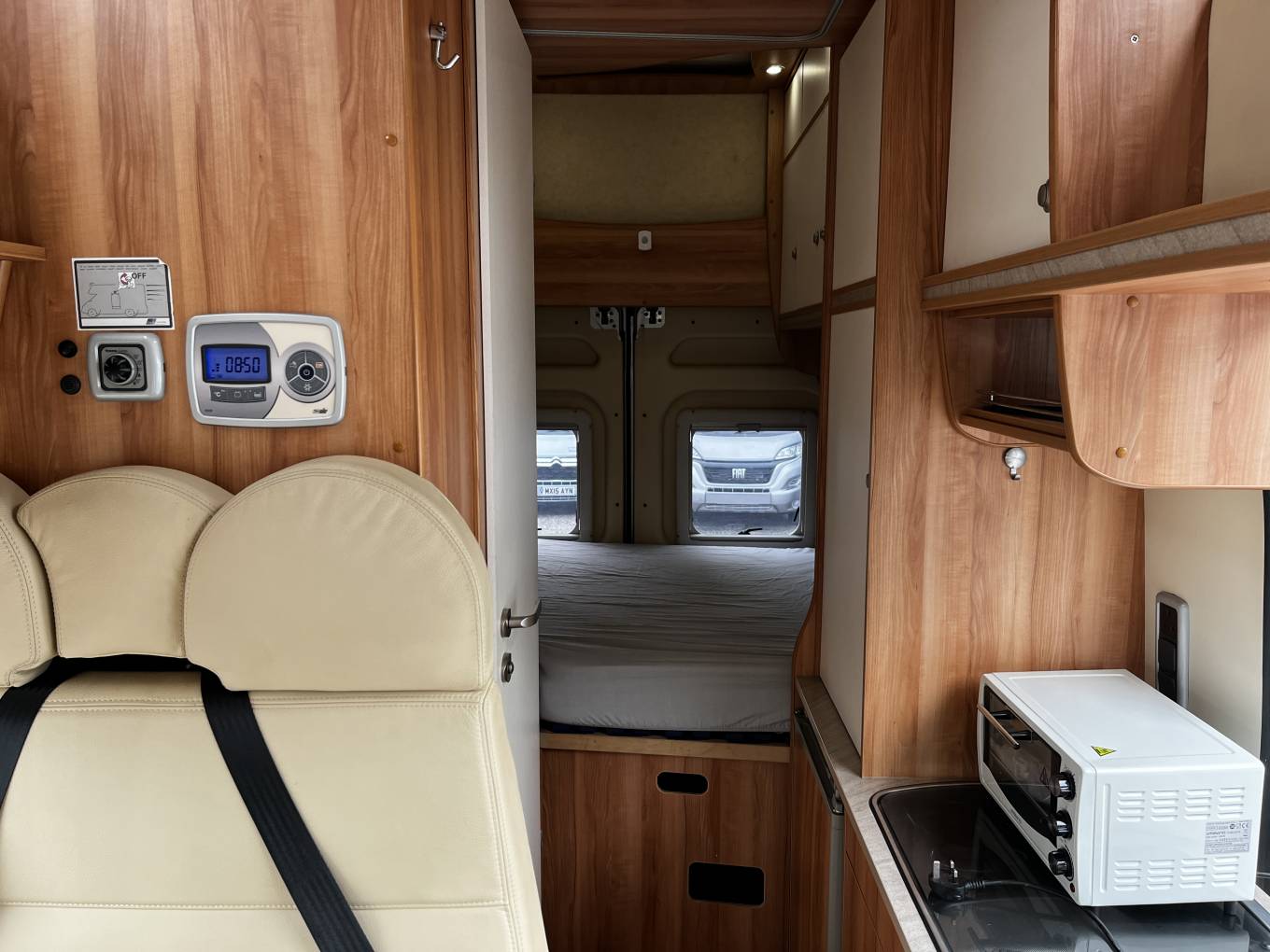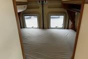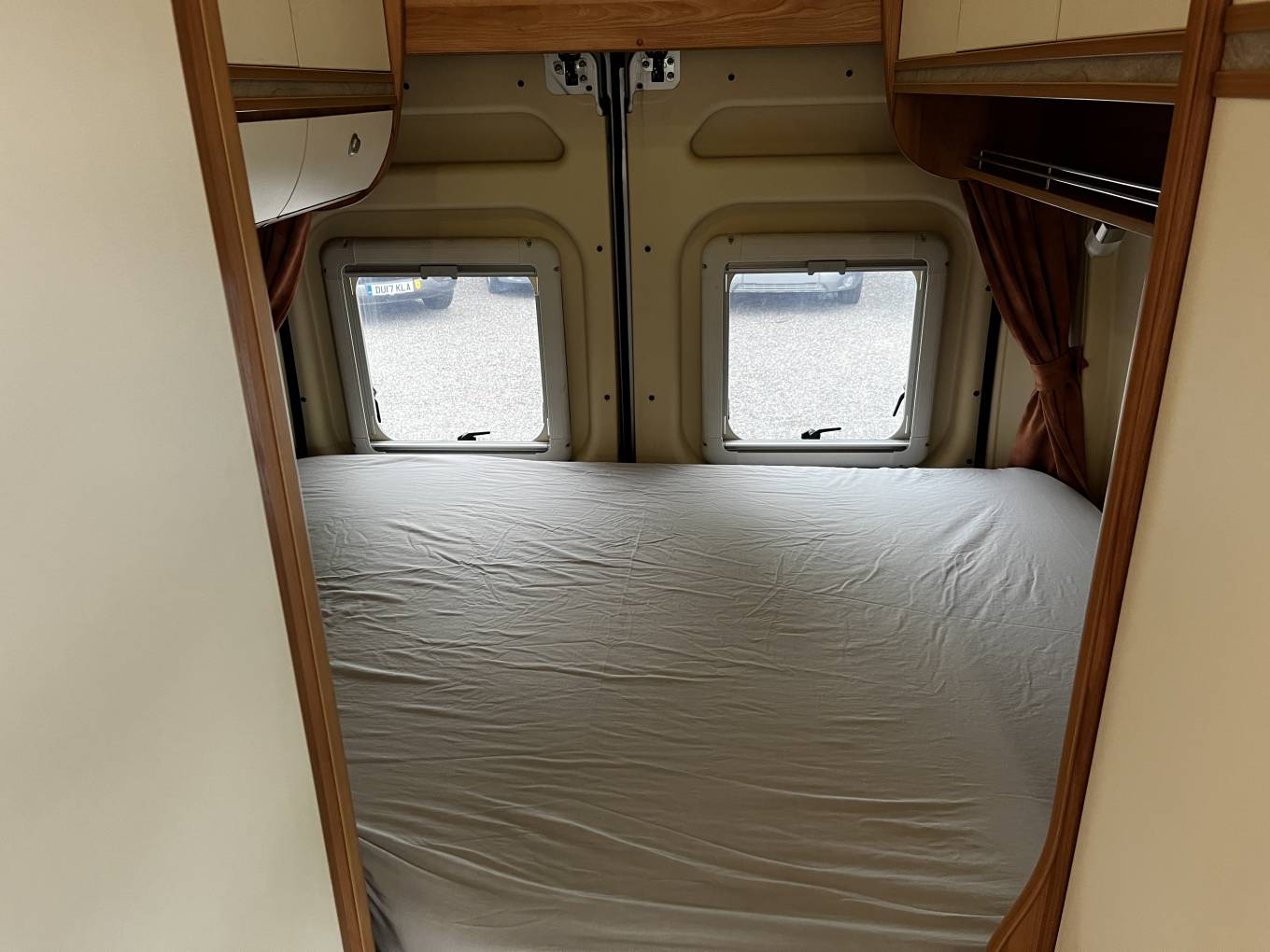 Rear double bed with extra foam topper, multiple storage cupboards and