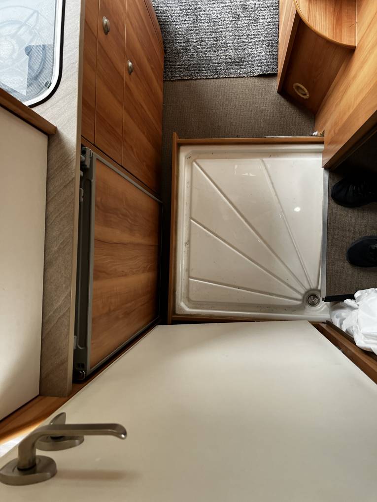 flush cassette toilet - Sink – pull out shower tray with shower curtain, storage,