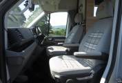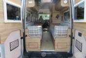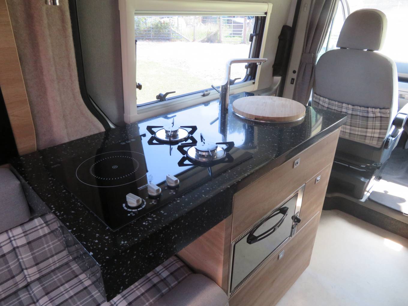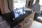 In the centre of the camper' is the kitchen, boasting stylish furniture and ingenious technology. It has everything you could need; a large fridge/freezer, a combined oven & grill along with a three-ring hob with two gas burners and one induction hob. The cupboards are made from high quality yet lightweight material, with a textured feel to provide that luxurious touch. Meanwhile, contrasting hardwood panels add to the stylish interior.