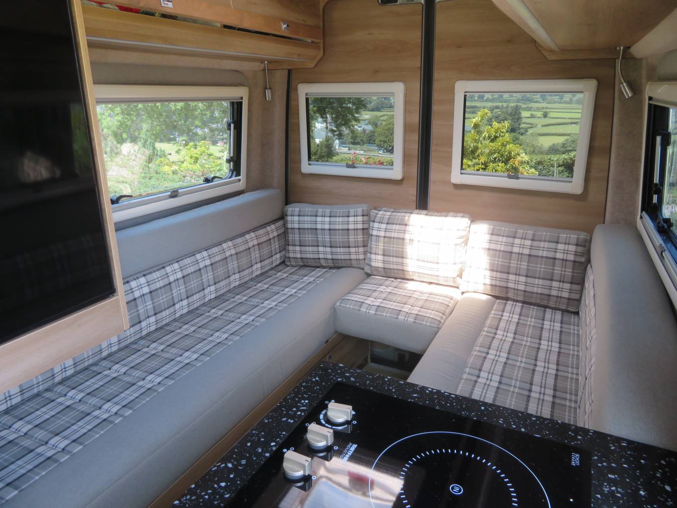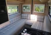 The lounge features a comfortable U-shaped sofa, perfect for relaxing and dining with the addition of the free standing table. The under seat area also provides access to the diesel heater, along with ample storage space. In the evenings the two sofas also easily form the sleeping arrangement, with a choice of two singles or one large double bed.