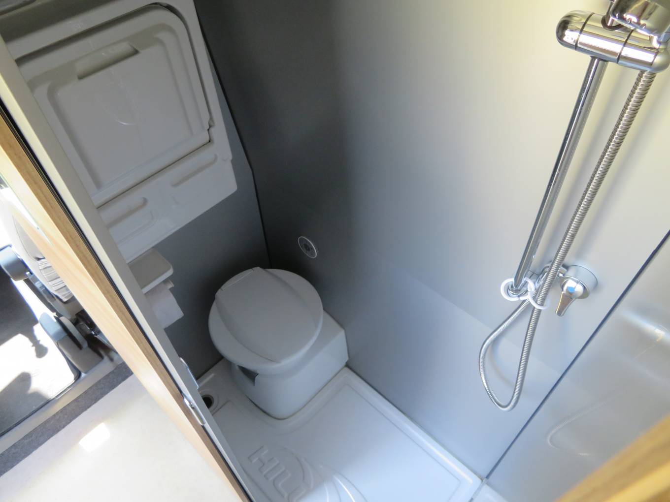 Opposite the kitchen is the washroom, spacious and stylish. It features a shower along with a fixed toilet. All throughout, the campervan meets all of your luxury camping needs with central diesel heating, water heating and a sleek control panel, capable of controlling much of the lighting and providing a display of the water levels.