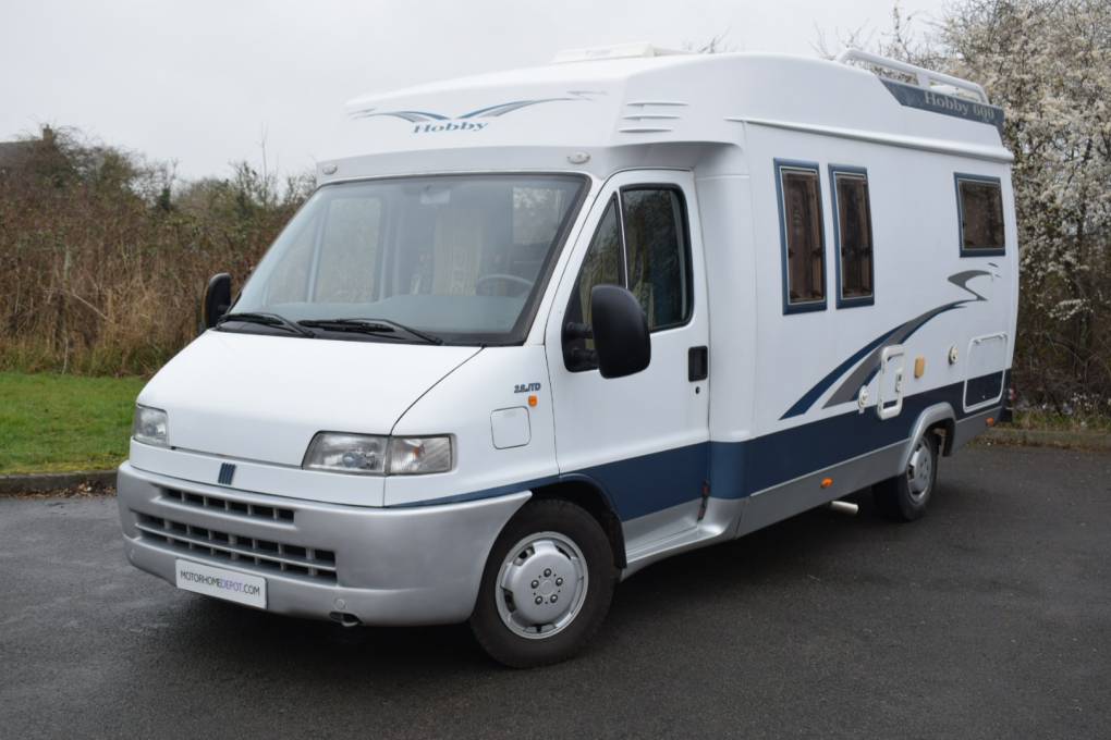 This Left Hand Drive Low Profile Hobby 600 motorhome has four berths, four seatbelts, is 6.4m long and has a gross weight of 3500kg. It is based on a Fiat Ducato with a 2.8 litre diesel engine with a manual gearbox.