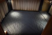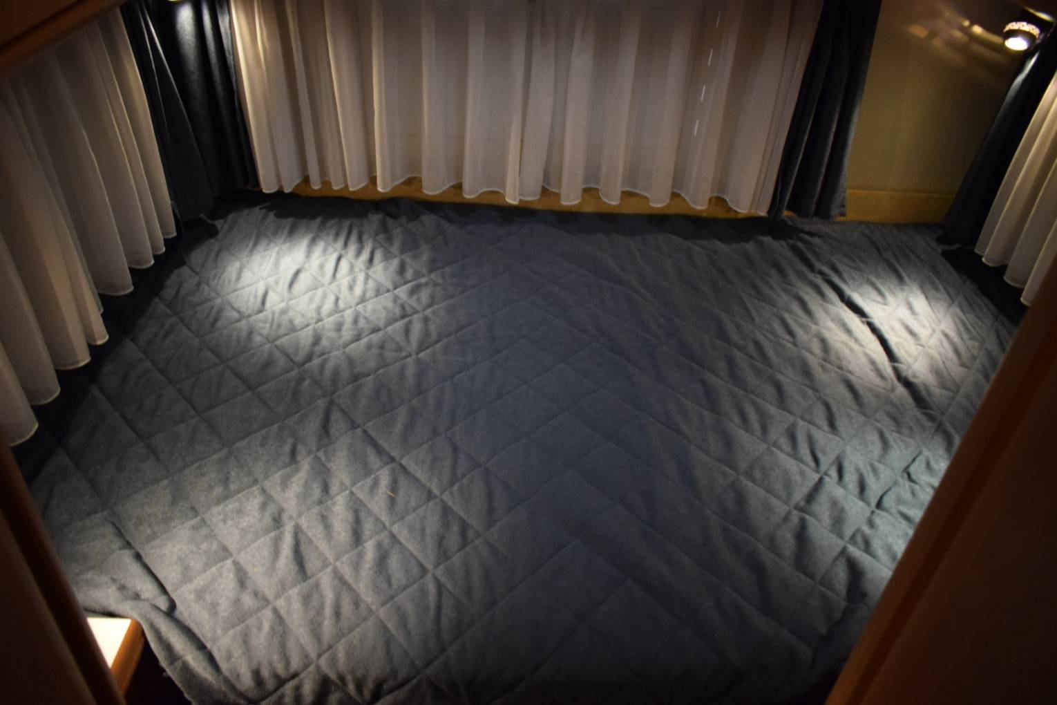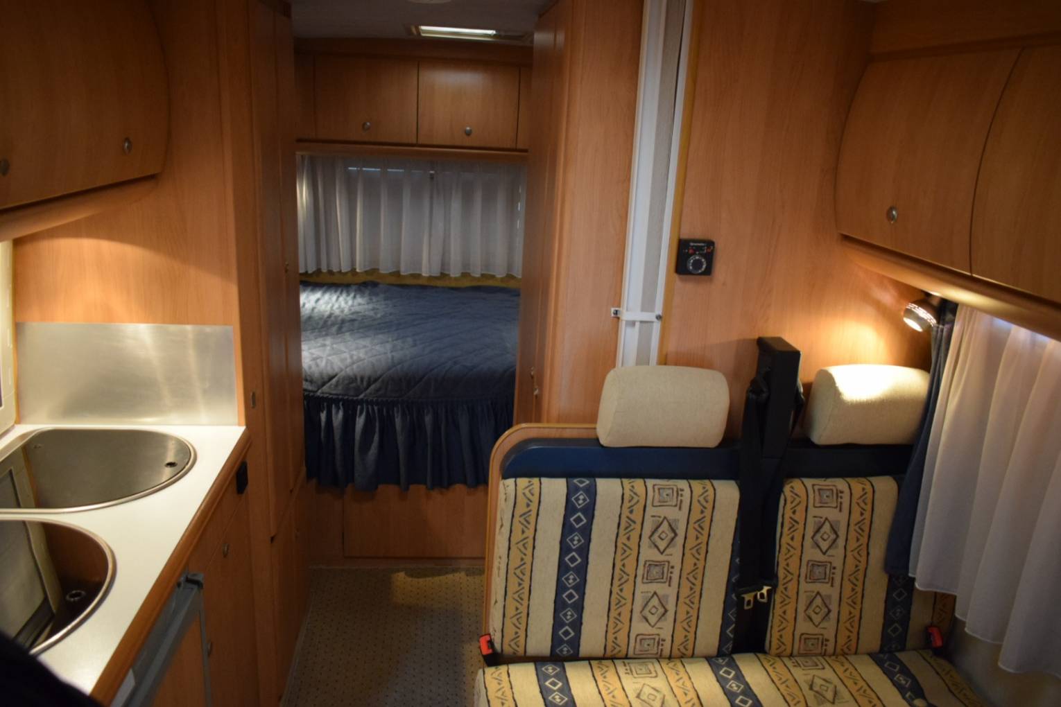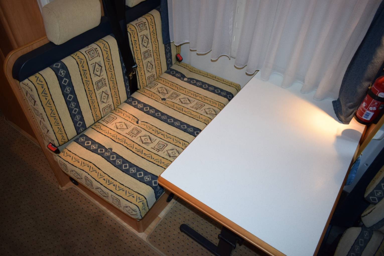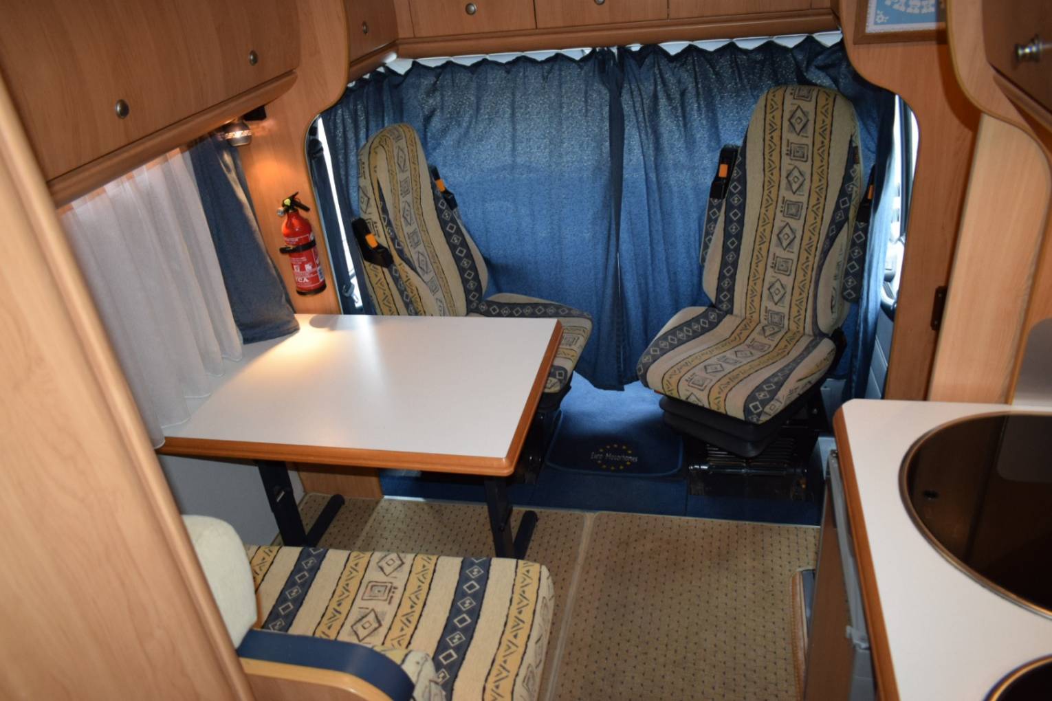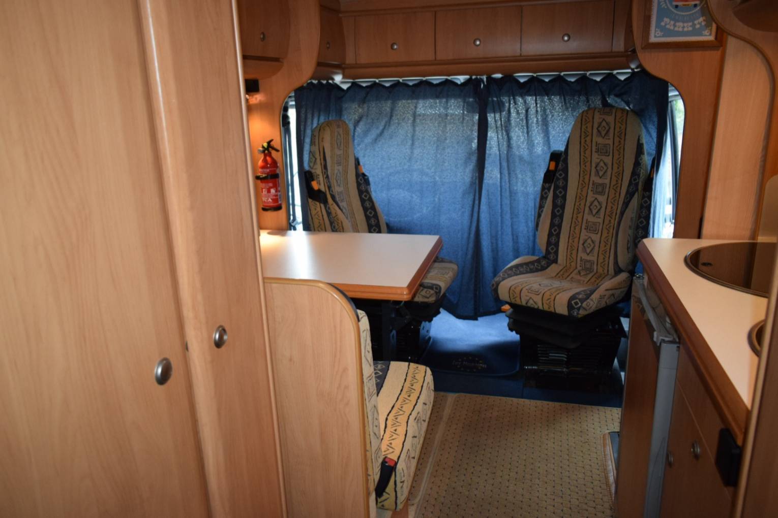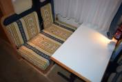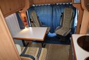 On entering via the caravan door in front of you is the dining table with two belted forward facing seats which together with the twin swivelling cab seats makes up the lounge area. The second double bed is made up here.