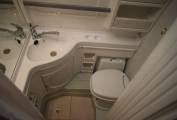Behind the the forward facing rear seats is the bathroom where you will find a Thetford swivel toilet, wash handbasin with a pull out shower hose. Opposite, rear of the kitchen is a wardrobe and across the back of the motorhome is a sizeable fixed double bed. Access to the huge storage area underneath is available from inside the motorhome and via hatches on both sides of the motorhome.