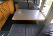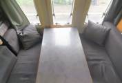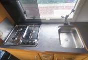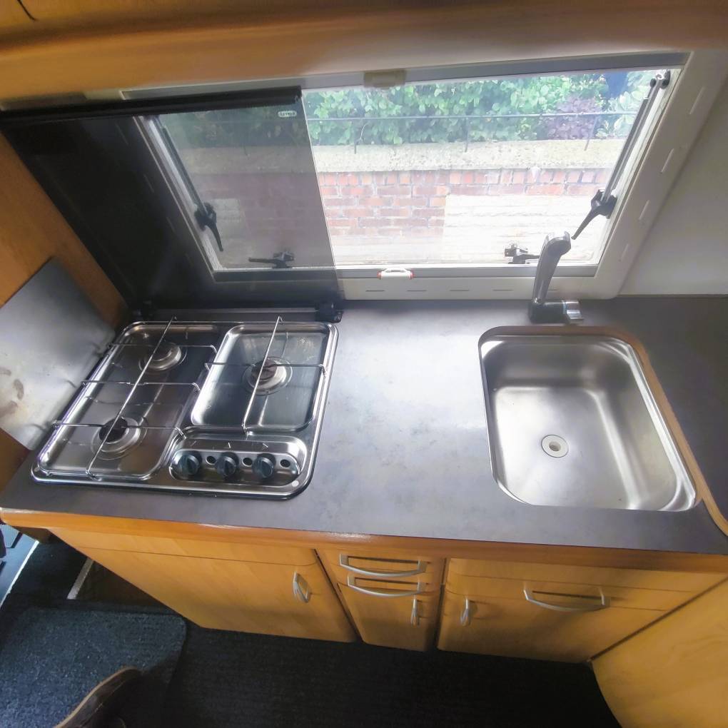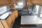 The washroom is to the rear and a good size, with a shower and bench mounted loo. The washbasin is alongside opposite the fixed rear bed with great storage beneath it. The kitchen offers a three burner hob and deep sink, with decent prep space. On the opposite side the dinette area is a good size, with a table and the two, two seater benches providing space for four.