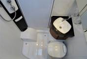 In the centre of the MH there is a immaculate good size washroom that features a shower, toilet and sink , with storage cabinets above.