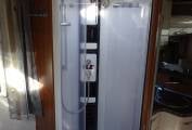 freezer compartment. Moving to the back of the motorhome the shower, washroom