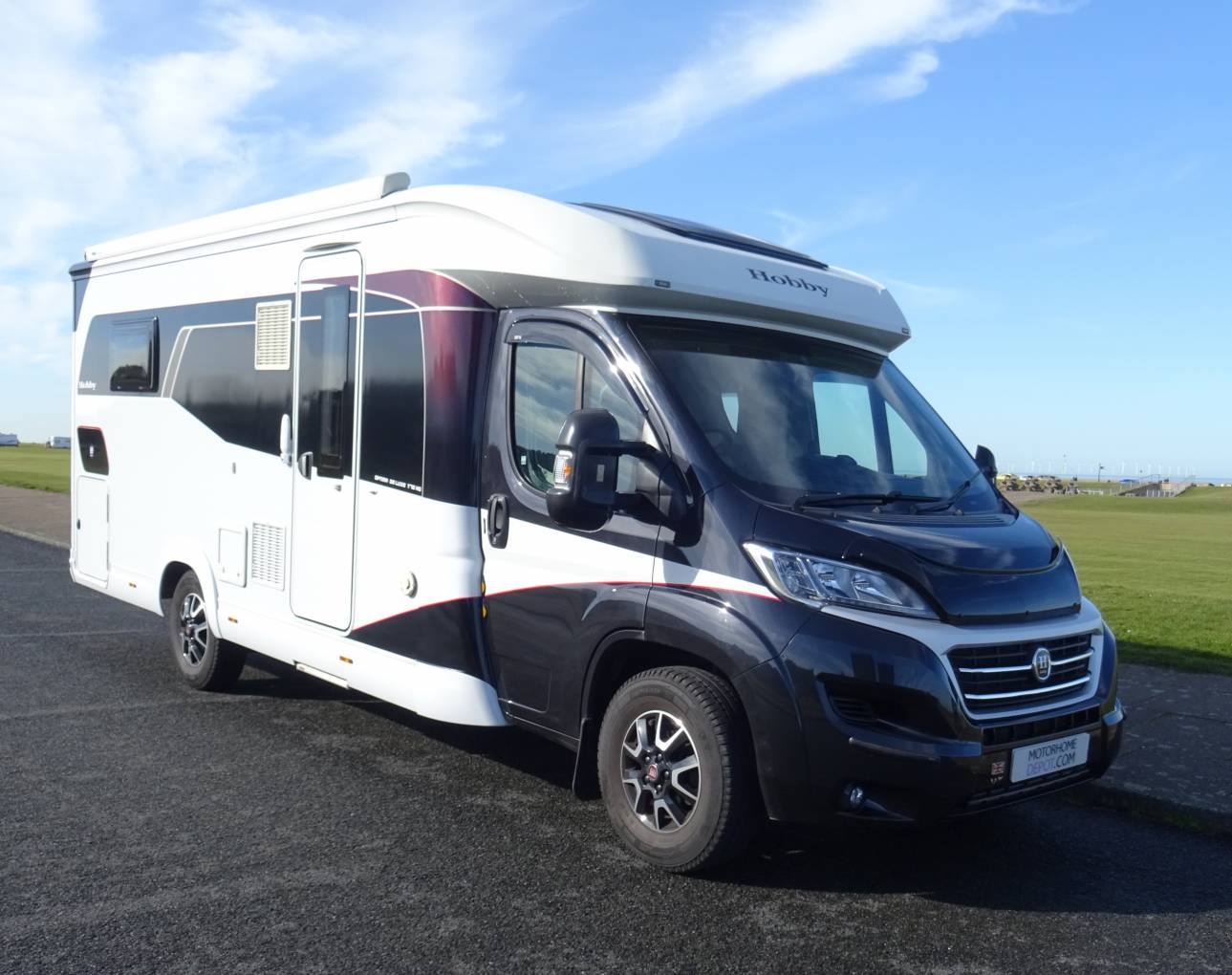 Motorhome Depot Chester and Wirral are pleased to present for sale this 2018 Hobby Optima Deluxe Black 50th Anniversary Edition T70 HQ, based on the Fiat Ducato, 2.3l multijet 150 bhp diesel engine driven by a manual 6 gear transmission. This 1 owner, 4 berth, 4 seat belted vehicle is one of Hobby's top luxury offerings built to typical high standards. It is priced competitivley for a prompt sale where news one, if available, are around £80,000. Up front there is air con, cruise control, sat nav built into Blaupunkt multi-media system, radio and cd player plus bluetooth, reversing camera, black-out blinds, electric mirrors (mirrors heated) and windows, Thatcham Cat 1 alarm/immobilizer and a tracker system.