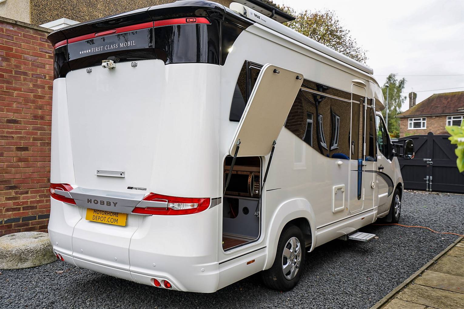 Spacious external Garage with doors to either side. Fitted with Microwave. To the rear are Thule bike rack fitting ready to install a bike rack. LED illuminated Hobby logo. LED rear light & position lights. Silver screens. BBQ point, External Shower, Twin Reversing Camera.