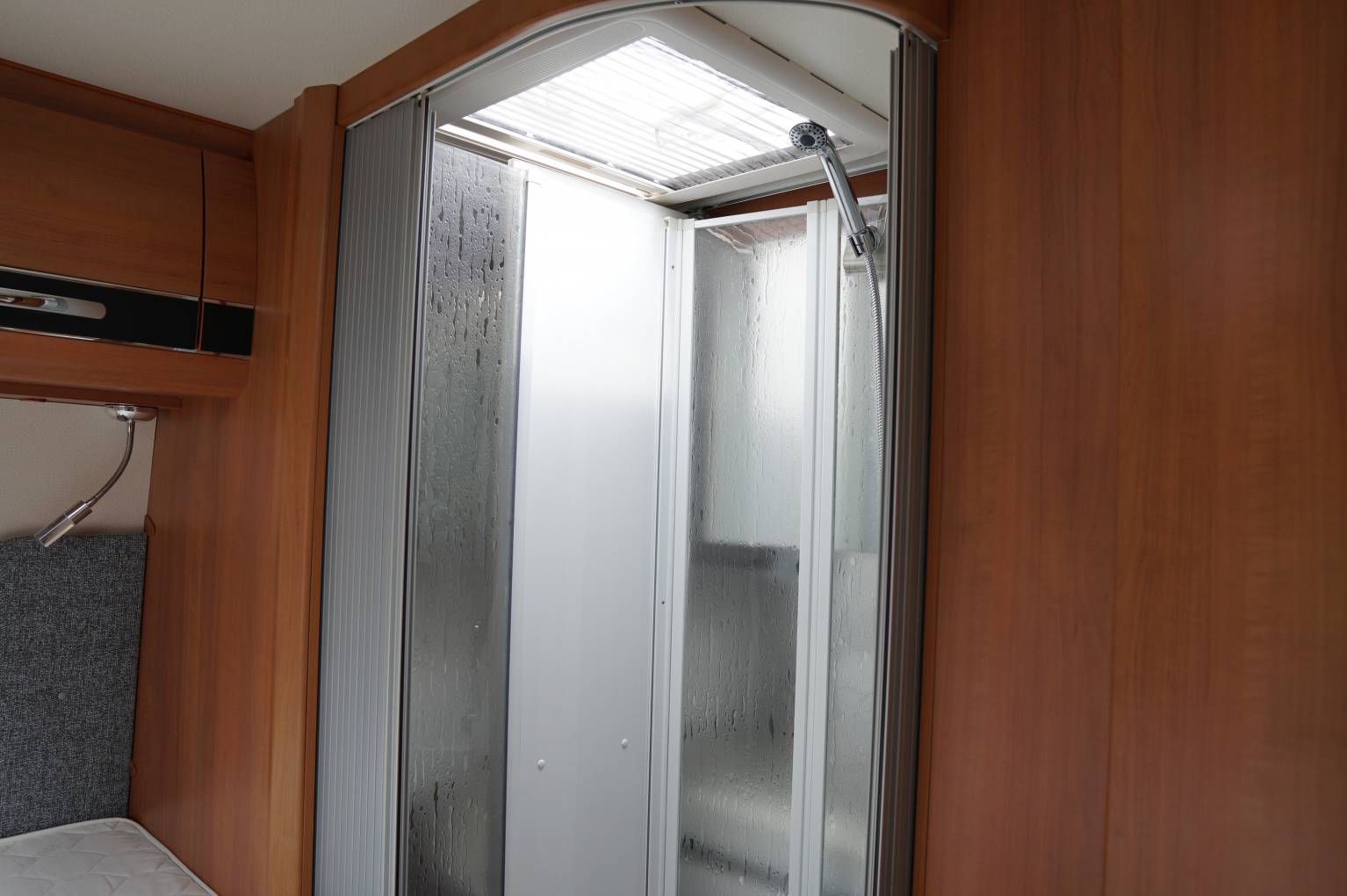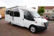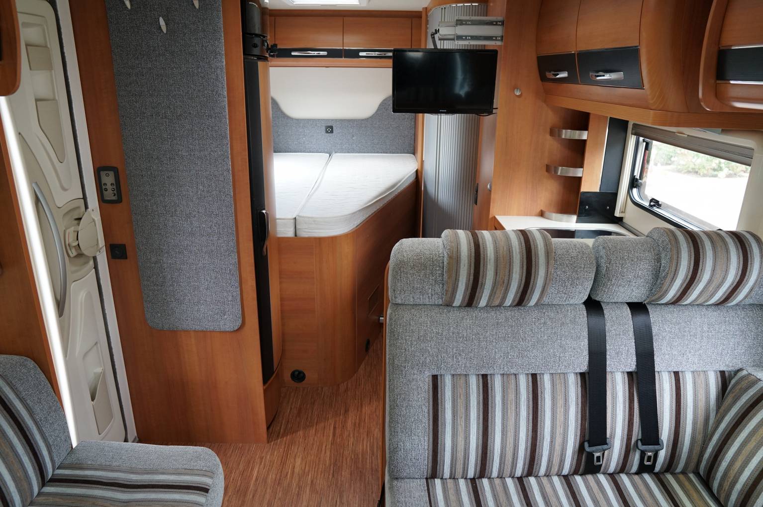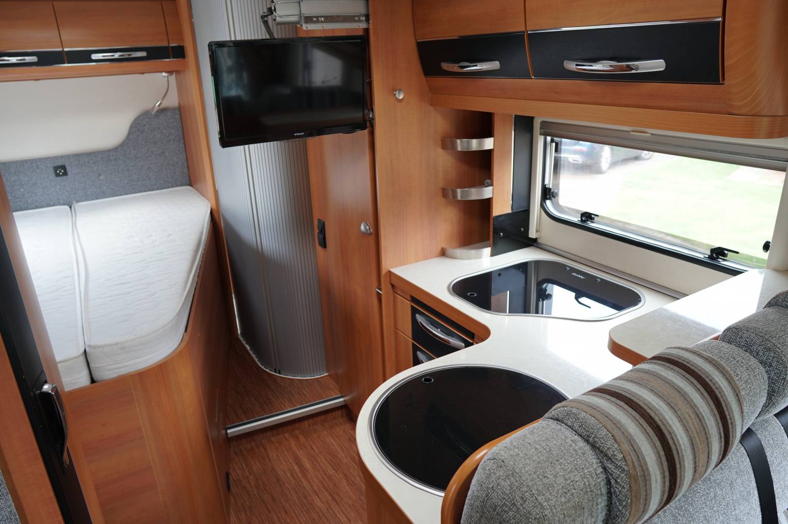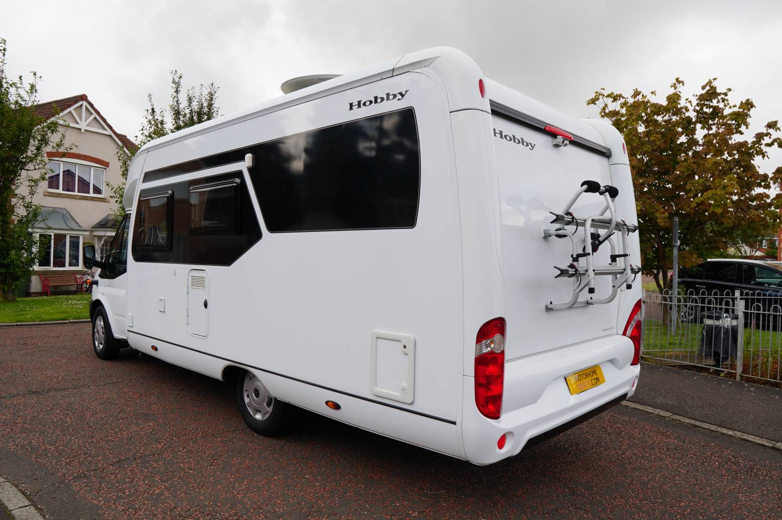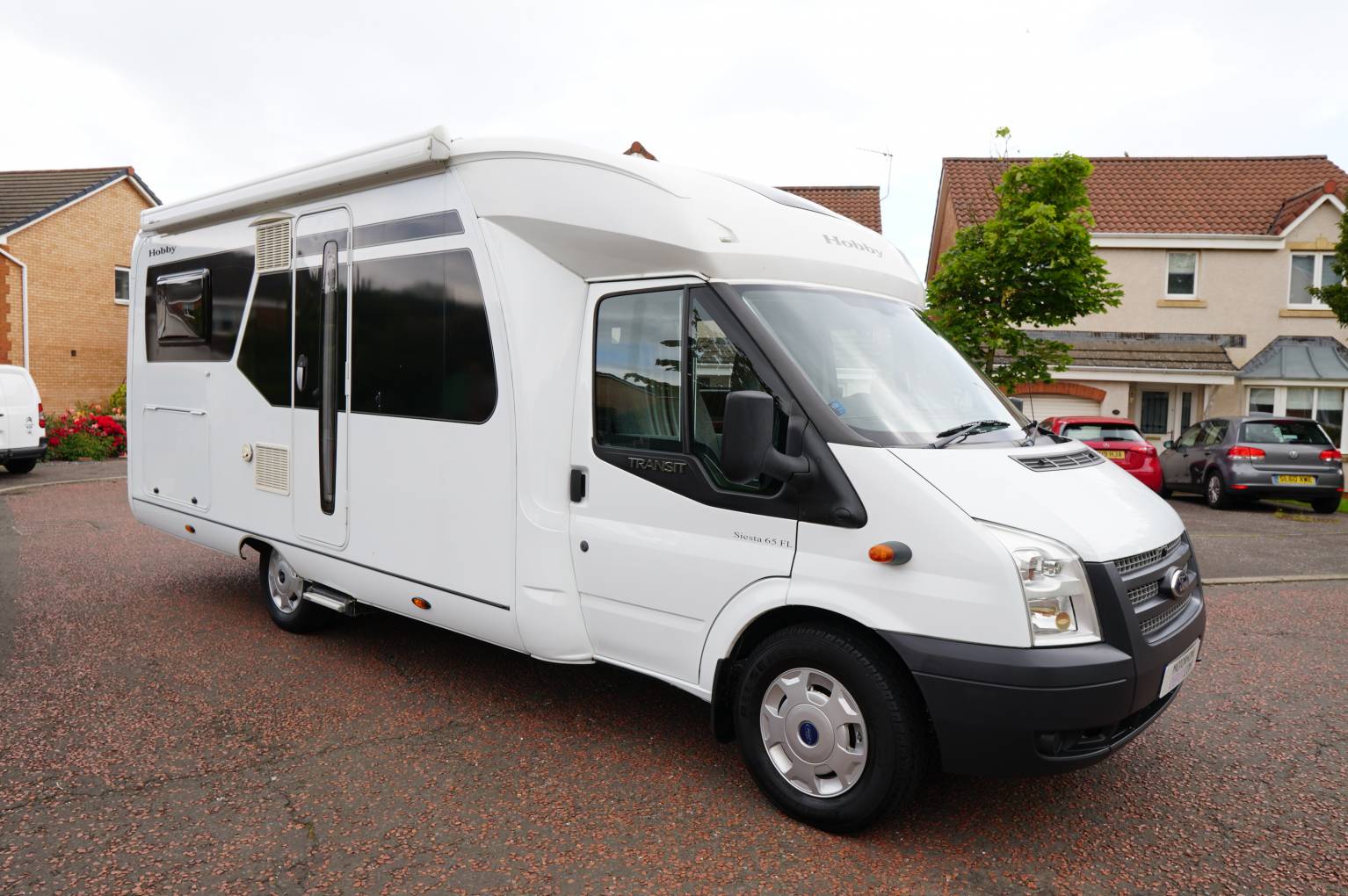 We have a 2013, Hobby Siesta 65FL, low-profile, 4-berth, 4 travelling seats, fixed rear bed, double drop-down bed, motorhome for sale. This very well-presented motorhome is based on a 2.2ltr Ford Transit with 6-speed gearbox, cruise control, cab air-conditioning, rear-view / reversing camera and Remis cab blinds. As you step into the motorhome, to the right is the lounge / dining area with L-shaped seating, small bench seat, large swivel table and with the two Captain’s chairs swivelled in to the area makes for a comfortable dining space for 6. Above this area you will find a double drop-down bed complete with nets both sides that are handy if the kids are up there. The kitchen area in the centre of the motorhome is equipped with a 3-burner gas hob, sink with mixer tap, small oven and large upright 3-way fridge/freezer. At the rear is the fixed French bed and adjacent is the washroom complete with Thetford cassette toiler, sink with mixer tap and a shower. There is ample storage above and below throughout with a large cupboard just forward of the washroom. You will also find a slide-out TV connected to the Oyster self-seeking satellite dish that can be enjoyed both in the lounge area and whilst in bed. There are removeable carpets throughout and the motorhome is winterised so year-round camping can be enjoyed. The Truma 240v / gas system supplies hot water and blown air heating. Externally, you will find a Fiamma wind-out awning with full Fiamma Safari Room included, solar panel that has a split charging system, 2 x gas bottles and bike rack.