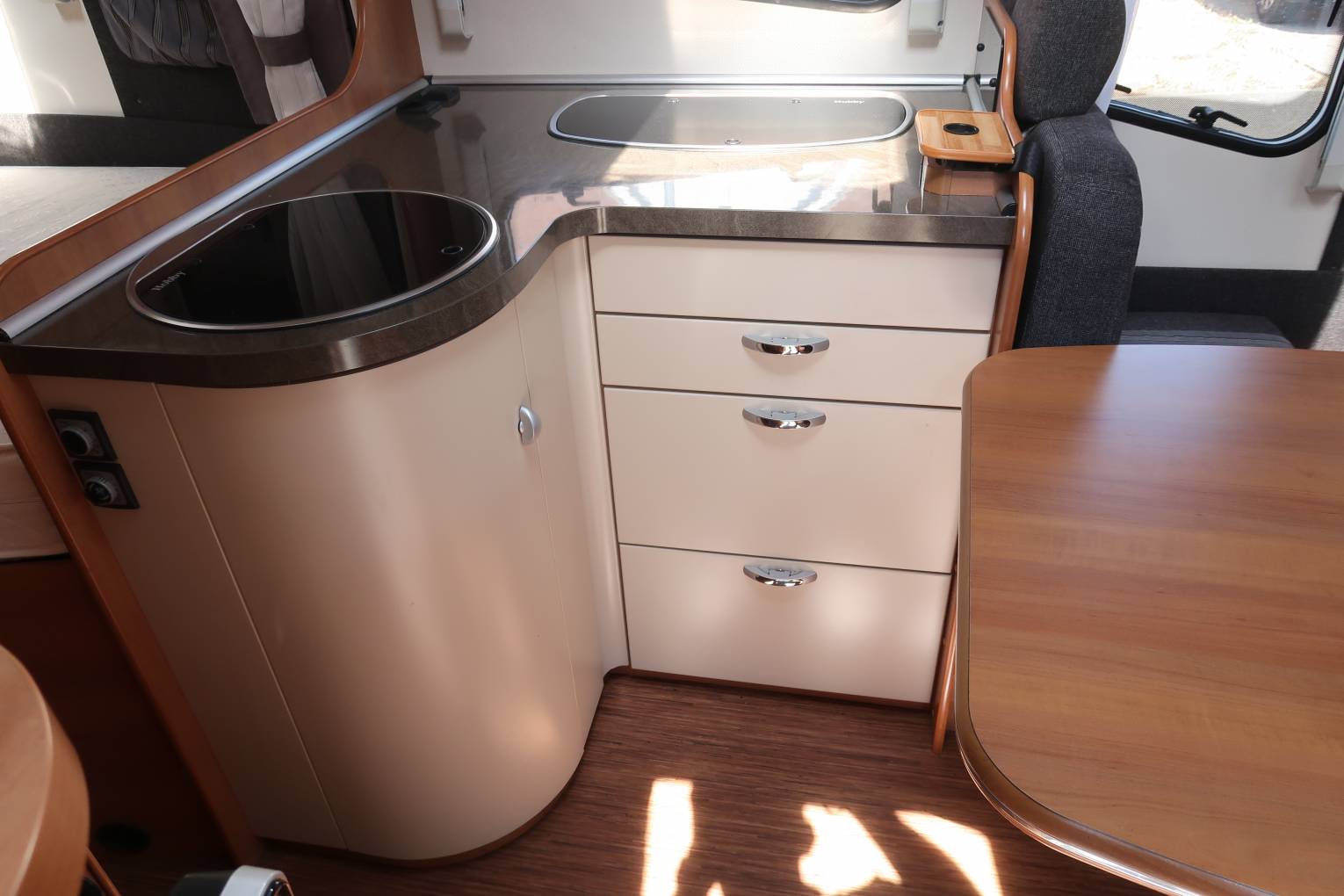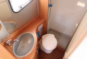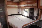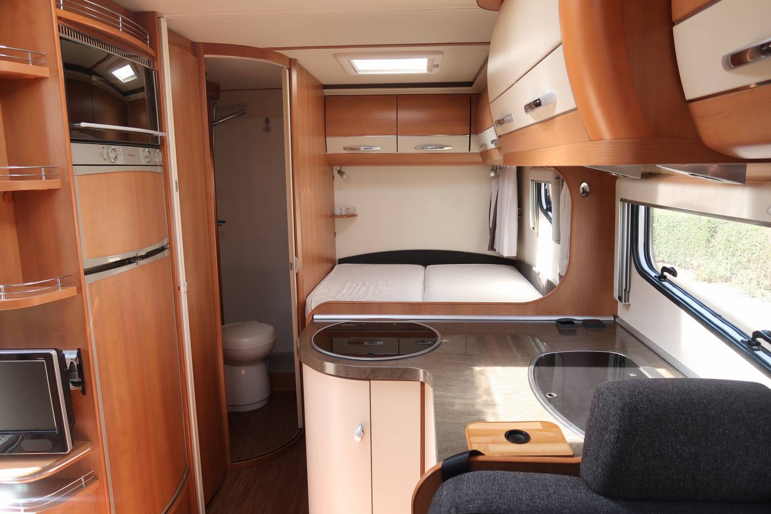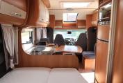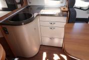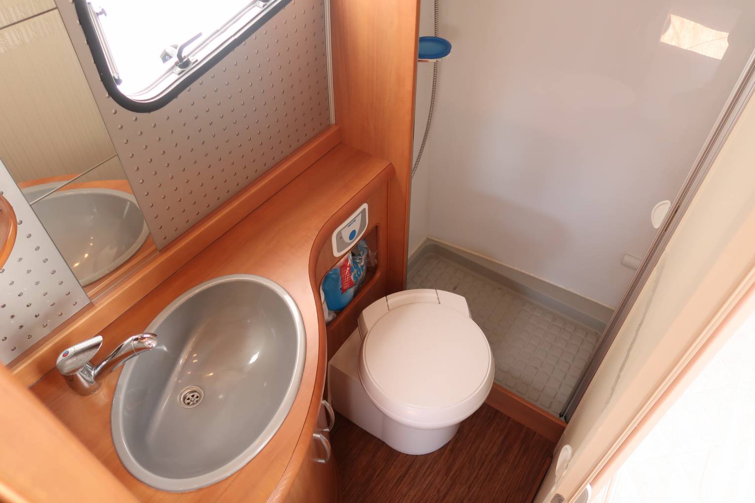 At the rear on one side you have a fixed french bed with plenty of storage space in the overhead lockers. The bed has power struts which allows it to be raised and underneath there is substantial extra storage space. Next to this is the stylish washroom consisting of a separate shower with a perspex screen, a Thetford cassette toilet, a wash basin with a mixer tap, a mirror and a bathroom cupboard to house your toiletries.