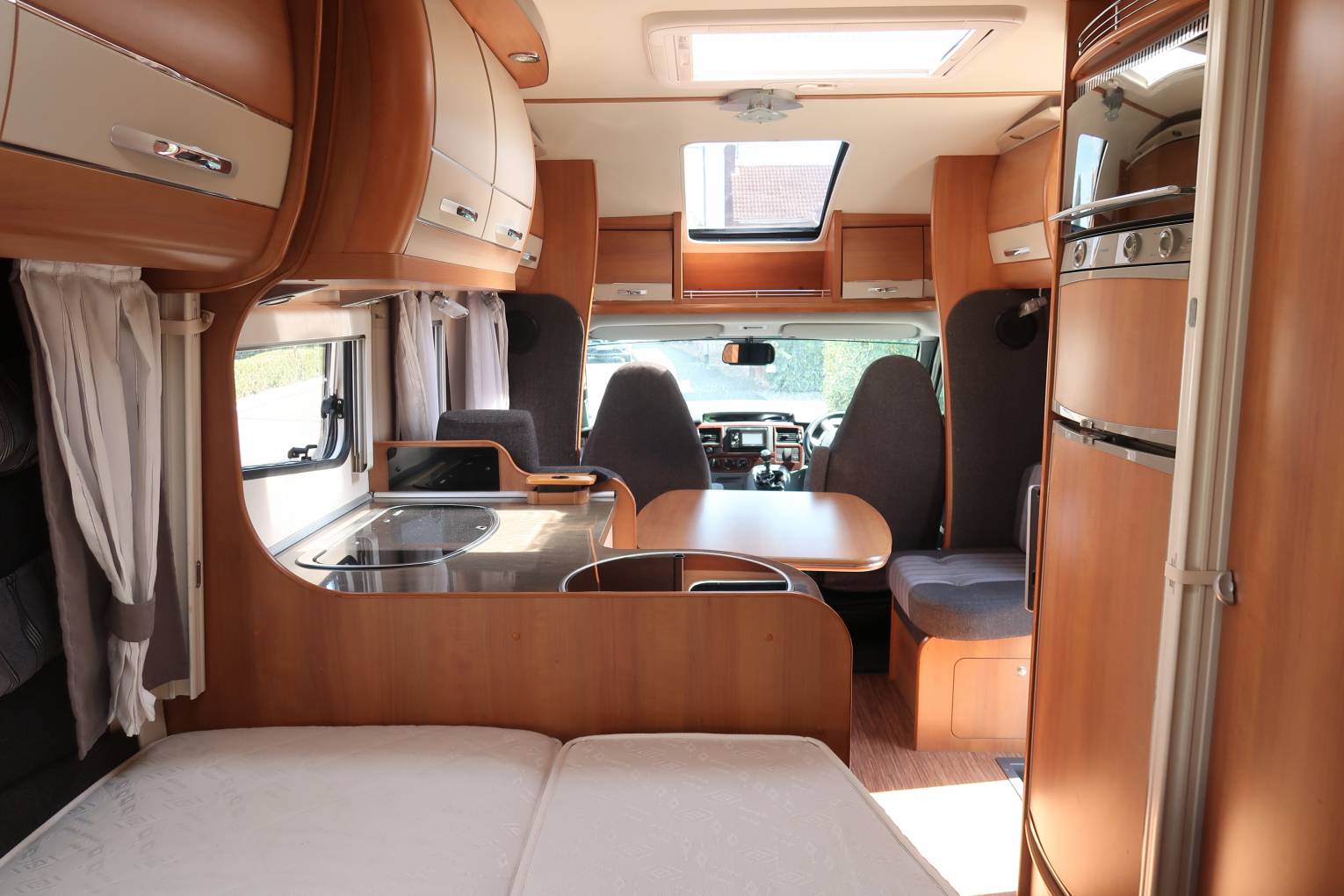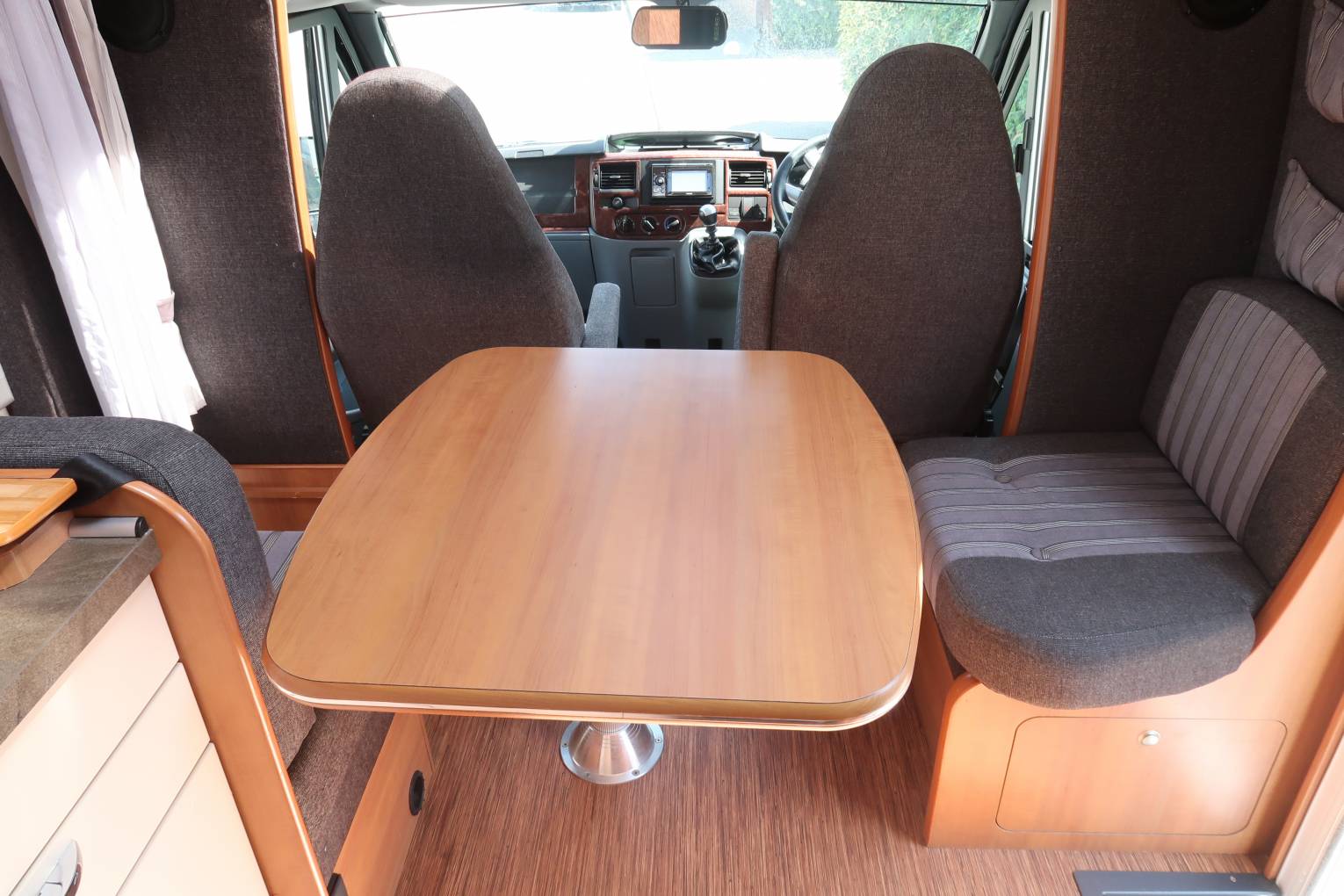 Behind the cab is the lovely lounge dinette. Here you have a forward facing chair fitted with a seatbelt and also a side facing chair. Swivel the 2 fronts seat around and 4 people can dine in real comfort on the sturdy dining table. Above both the cab and dinette are large skylights which throw in plenty of natural light making the dinette a lovely spot to relax in and enjoy a few drinks. There is also an Avtex TV which runs of both 12 and 230 volts.