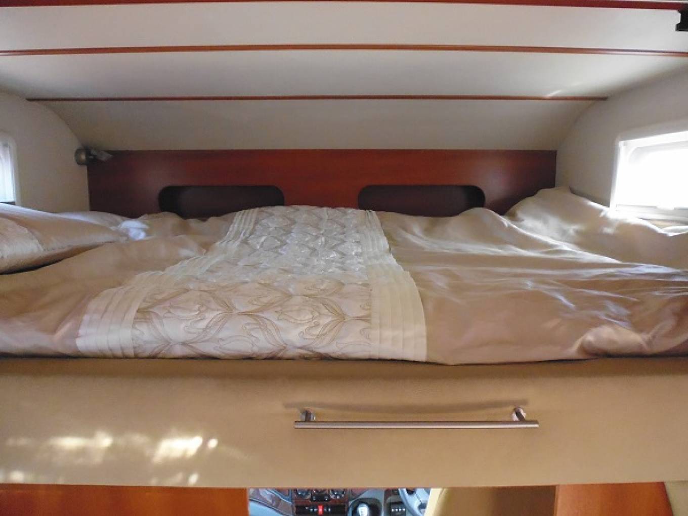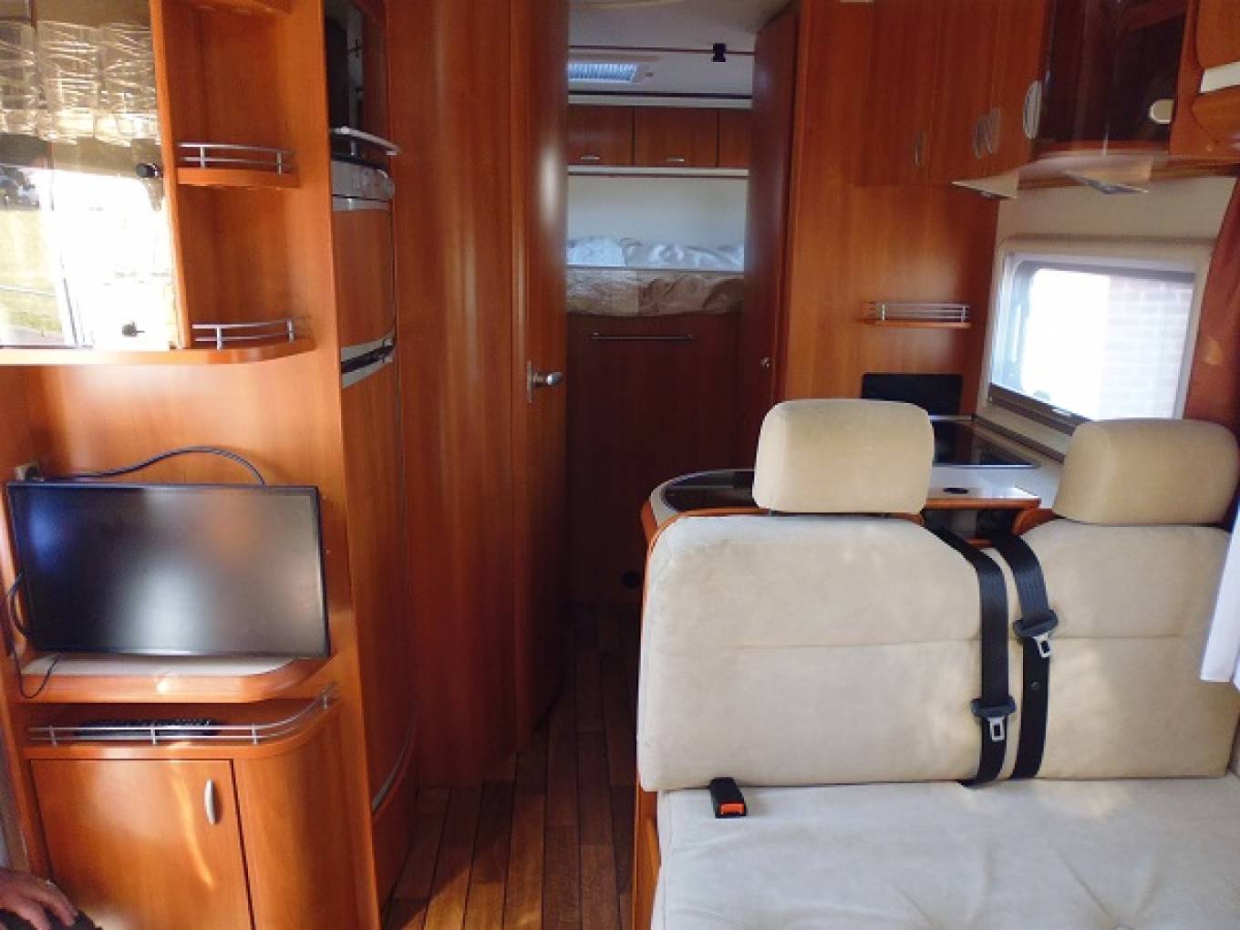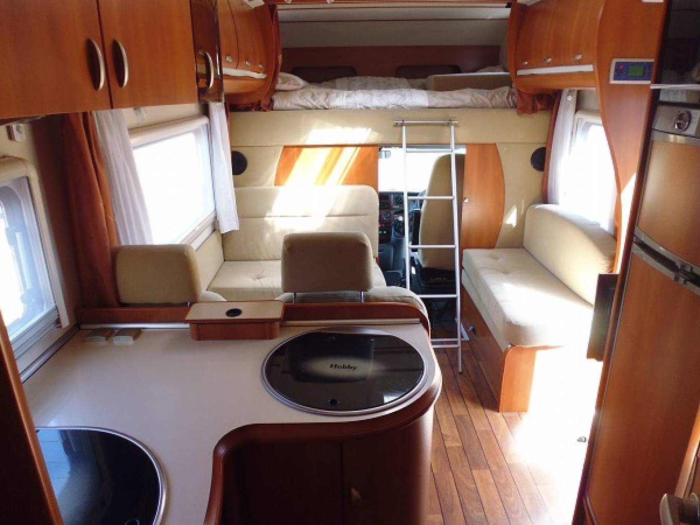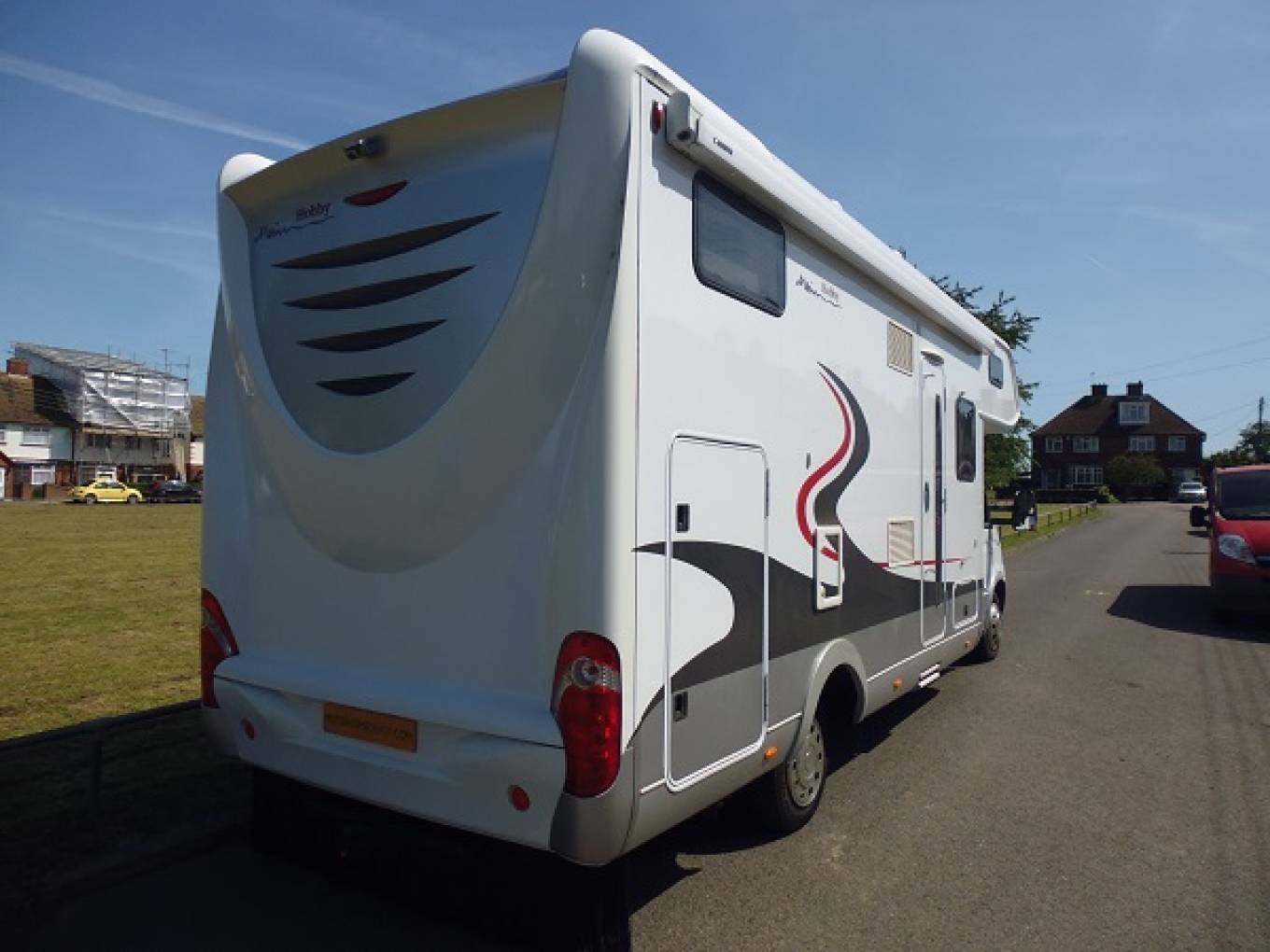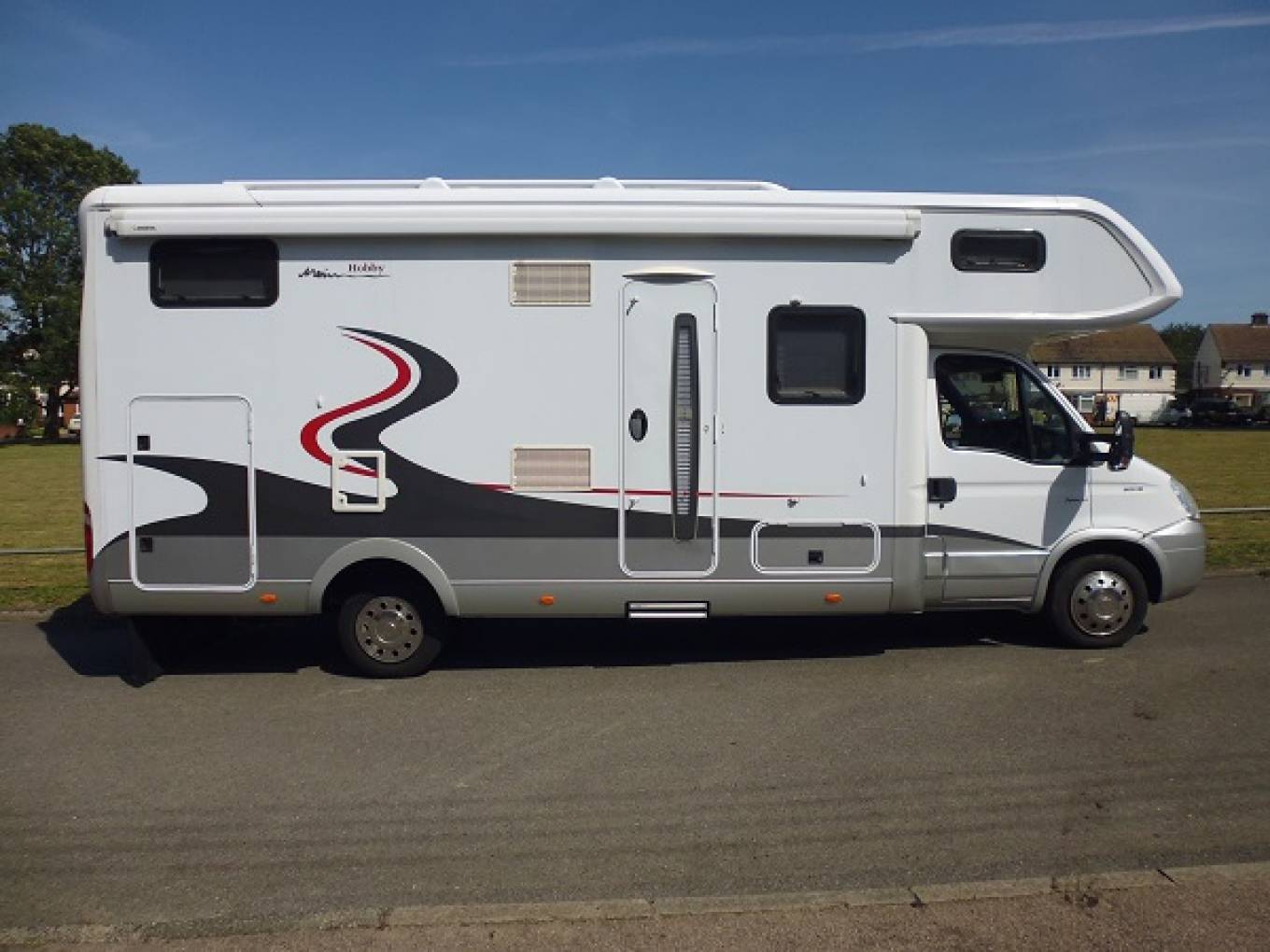 Excellent example of Hobbys Sphynx 725g model. This top of the range motorhome is a garage model with a fixed double bed above. There are further doubles above the cab and in the dinette area making this a six berth with 4 seatbelts. This is fantastic German quality and has covered only 25k miles by 2 private owners. Based on the 180bhp 3.0 turbodiesel Iveco cab and chassis. In addition to the high standard spec, this model also includes air suspension, 4.5 metre awning and safari room, twin rear cameras, satnav, towbar, gas it refillable bottles and 2x 110 amp gel leisure batteries.