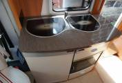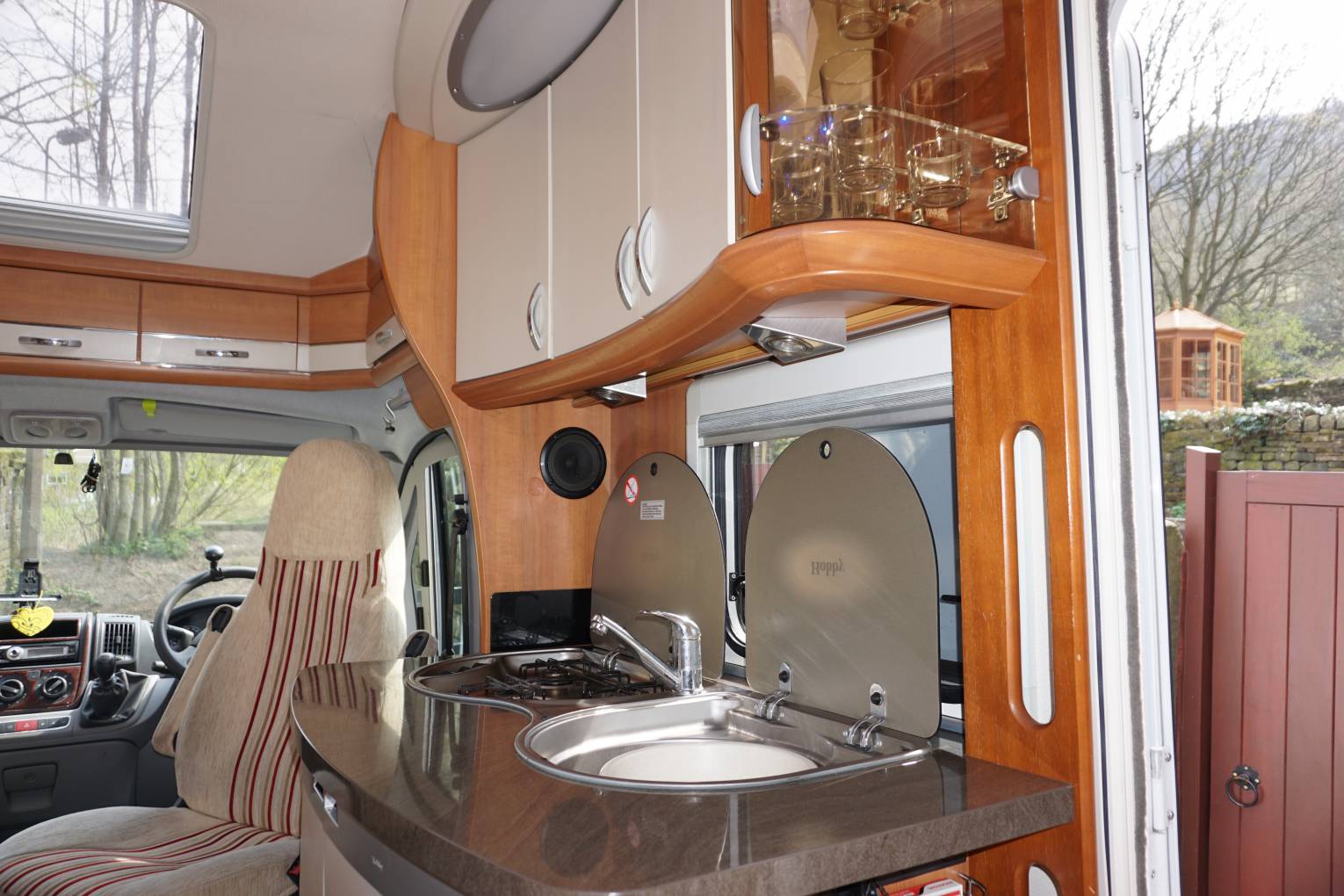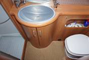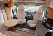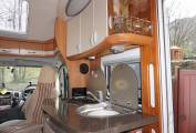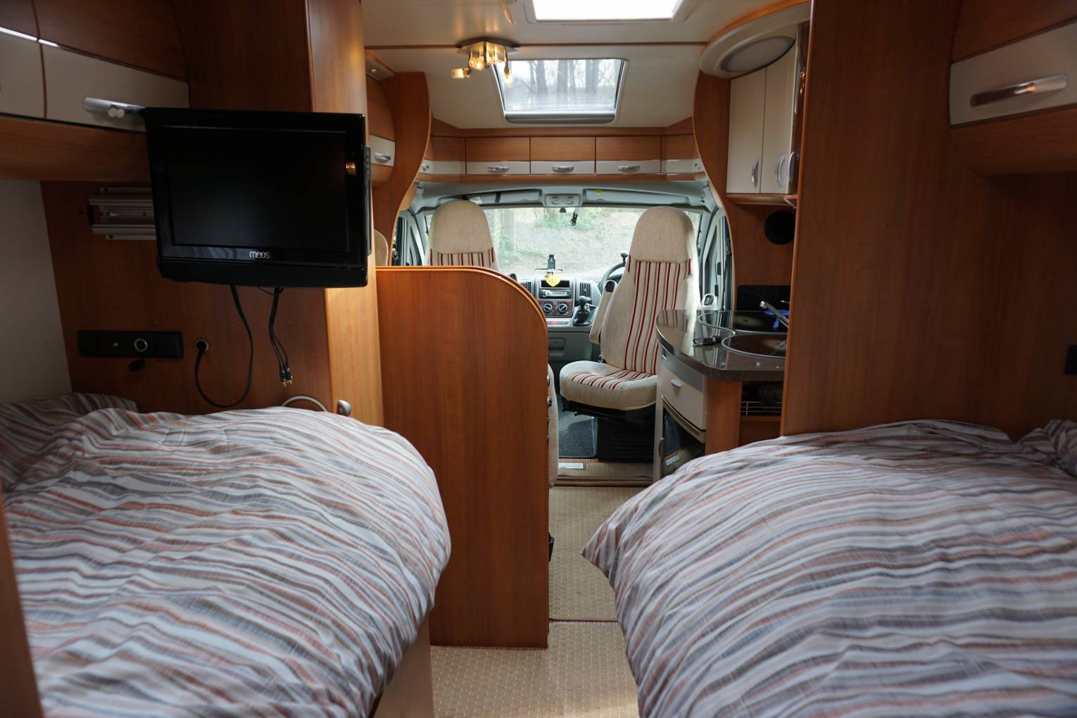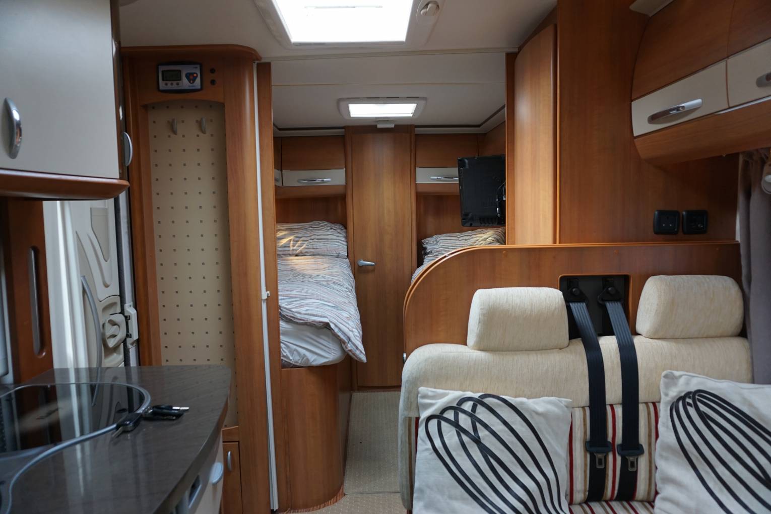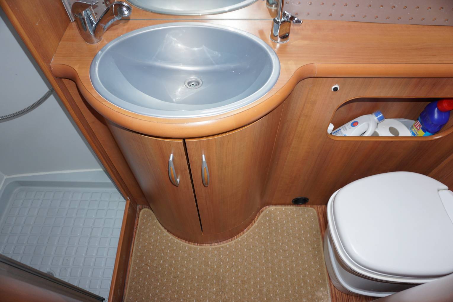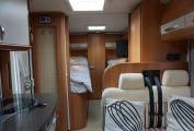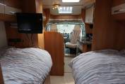 As you would expect this is a quality German built low profile fully winterised double floor construction motorhome and benefits from some very nice luxury features. At the rear behind the two parallel fixed beds there is a good sized bathroom with seperate shower. Also including a good sized storage cupboard. There is plenty of storage space around the motorhome with cupboards virtually all around the roof line of the inside the. To the front we have the well equipped kitchen area with separate fridge/freezer and good work surface. At the front we have the very comfortable dinette area which has the choice of either a large Free standing extendable table or a smaller round table. The two forward facing seats come with two additional seat belts for travelling guests. two travelling seat belts are also located here.