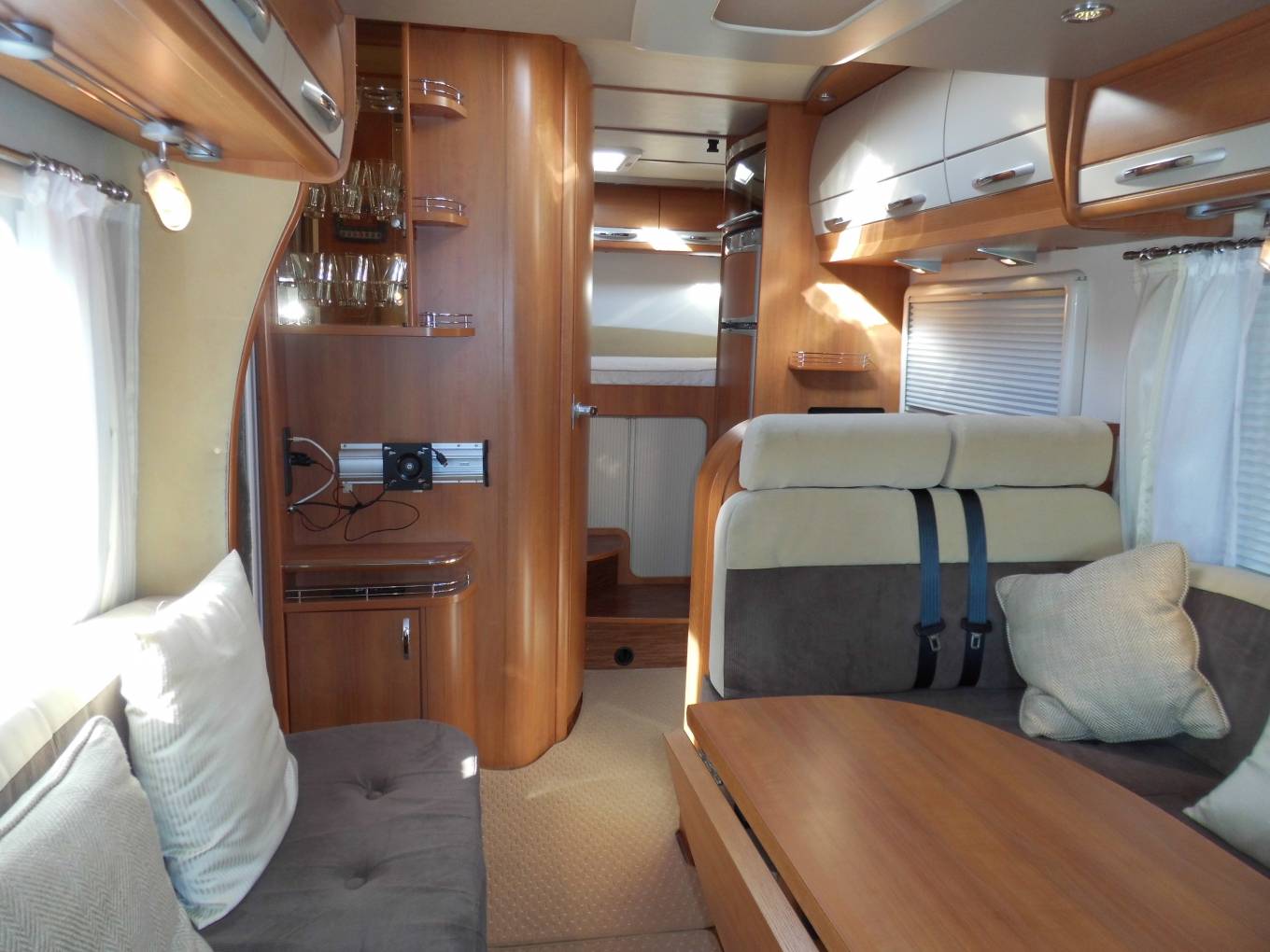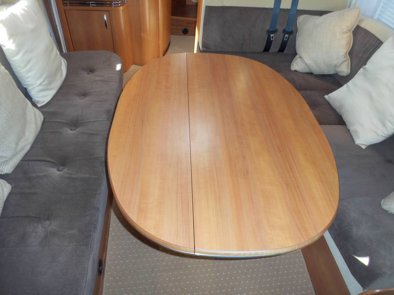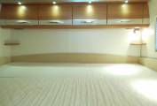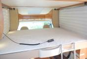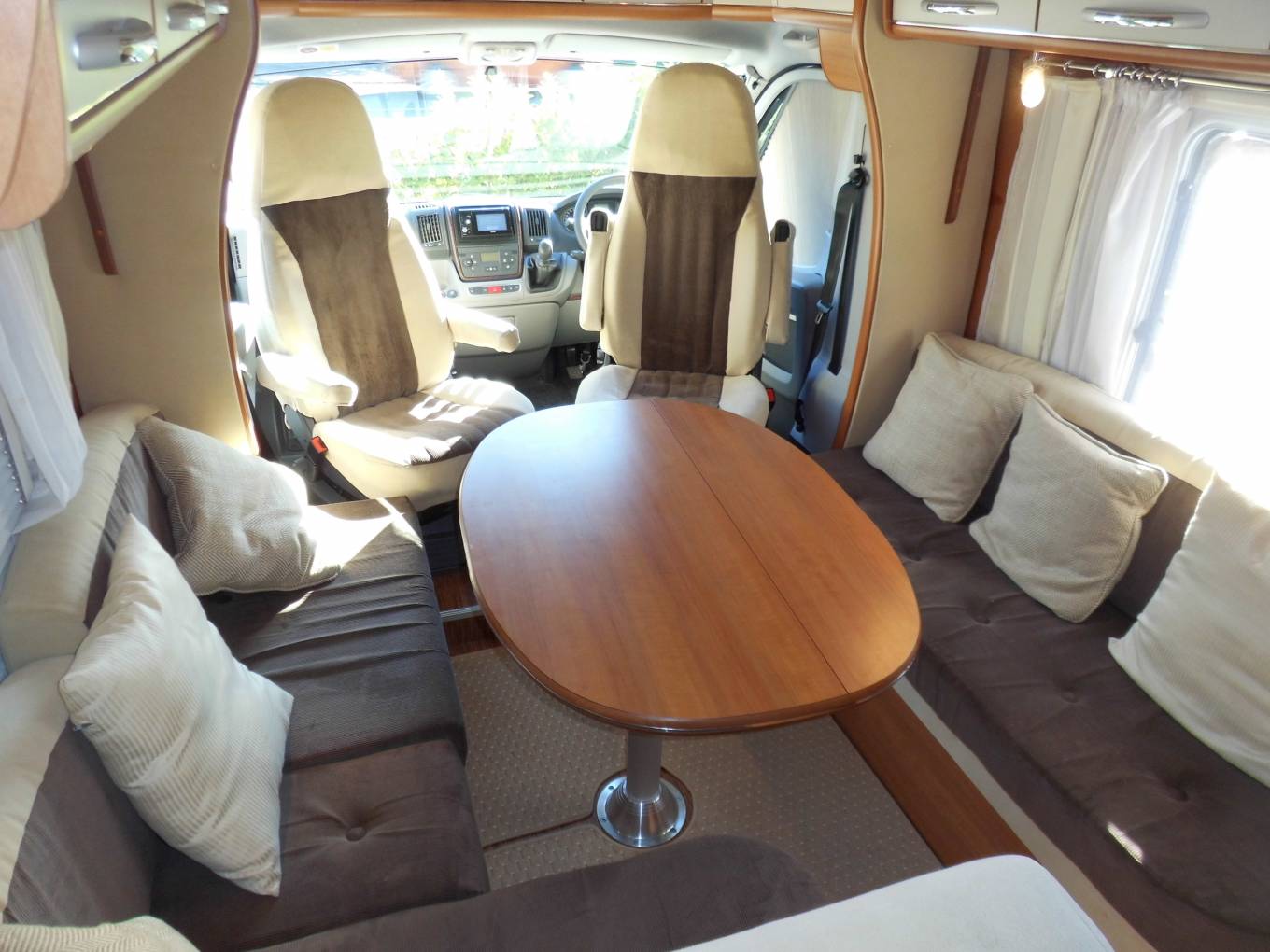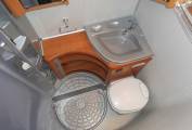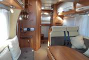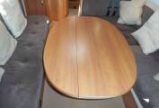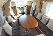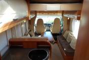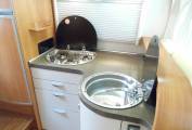 Above the lounge is a good sized and substantial electric drop-down double bed which can be lowered or raised quickly and easily by a flick of the switch. The L-shaped lounge is remarkably comfortable, being made up of an L-shaped seat, a side-facing seat and the swivelled cab seats. It houses five in comfort around the oval table.