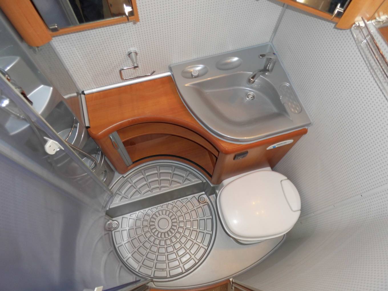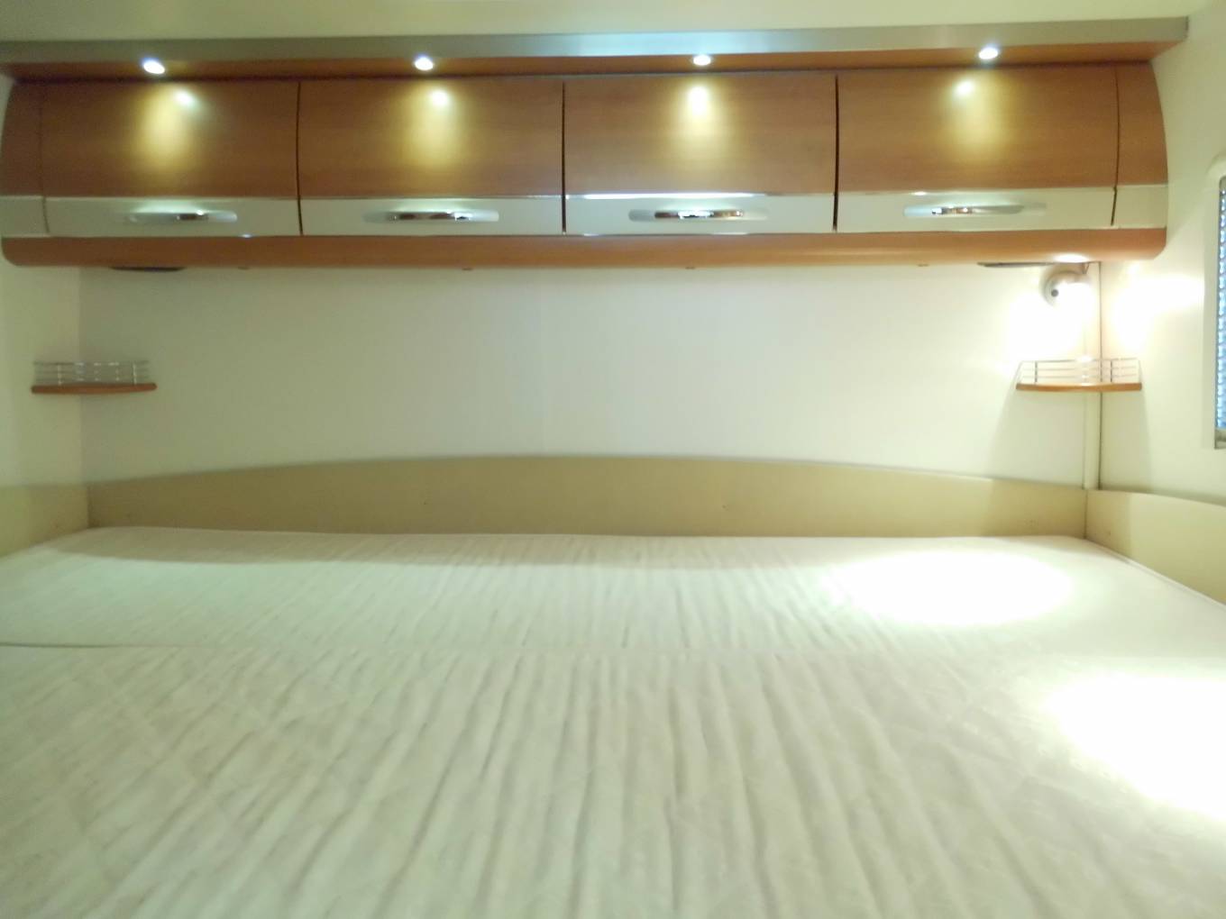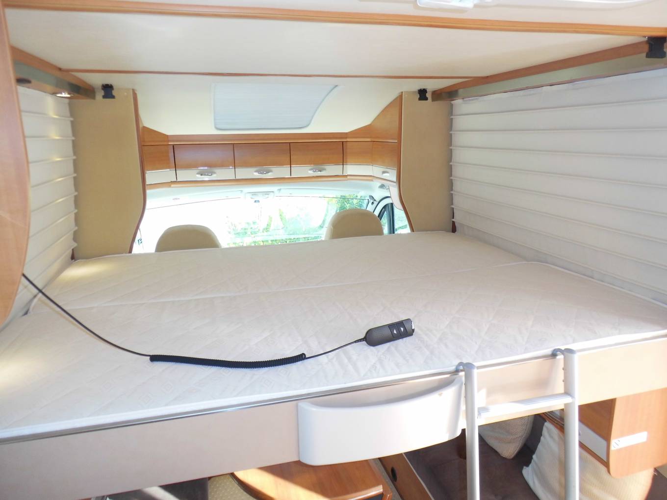 Above the lounge is a good sized and substantial electric drop-down double bed which can be lowered or raised quickly and easily by a flick of the switch. The L-shaped lounge is remarkably comfortable, being made up of an L-shaped seat, a side-facing seat and the swivelled cab seats. It houses five in comfort around the oval table.