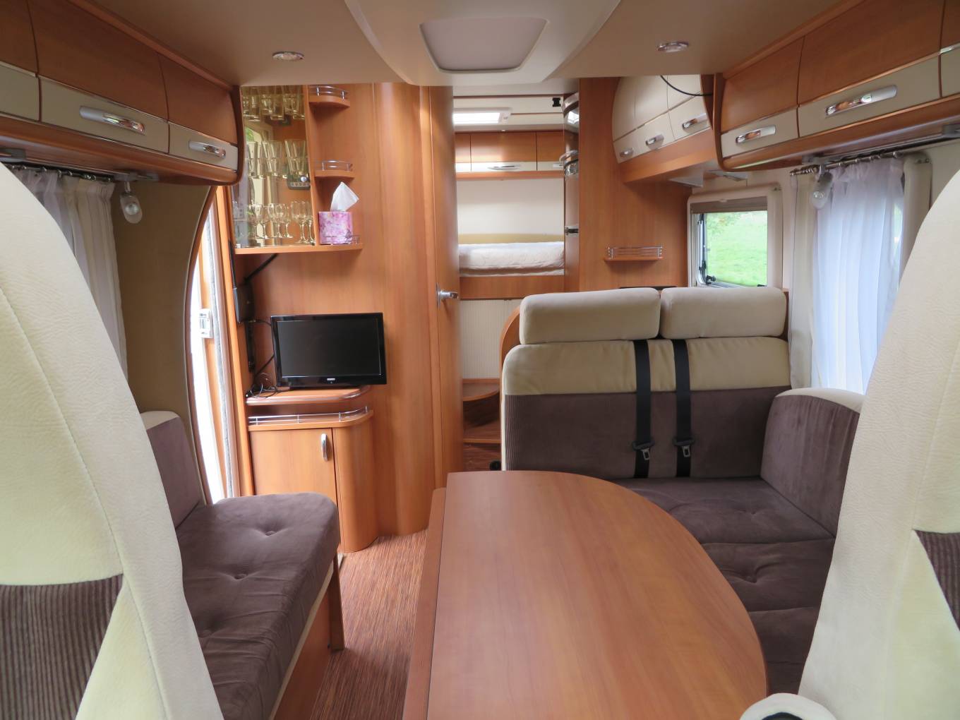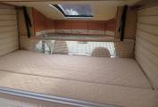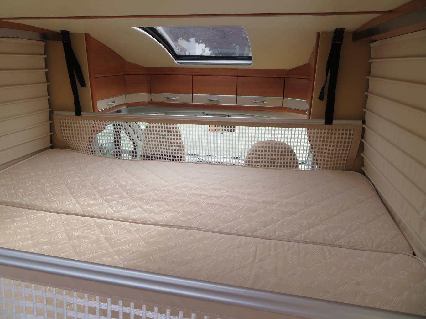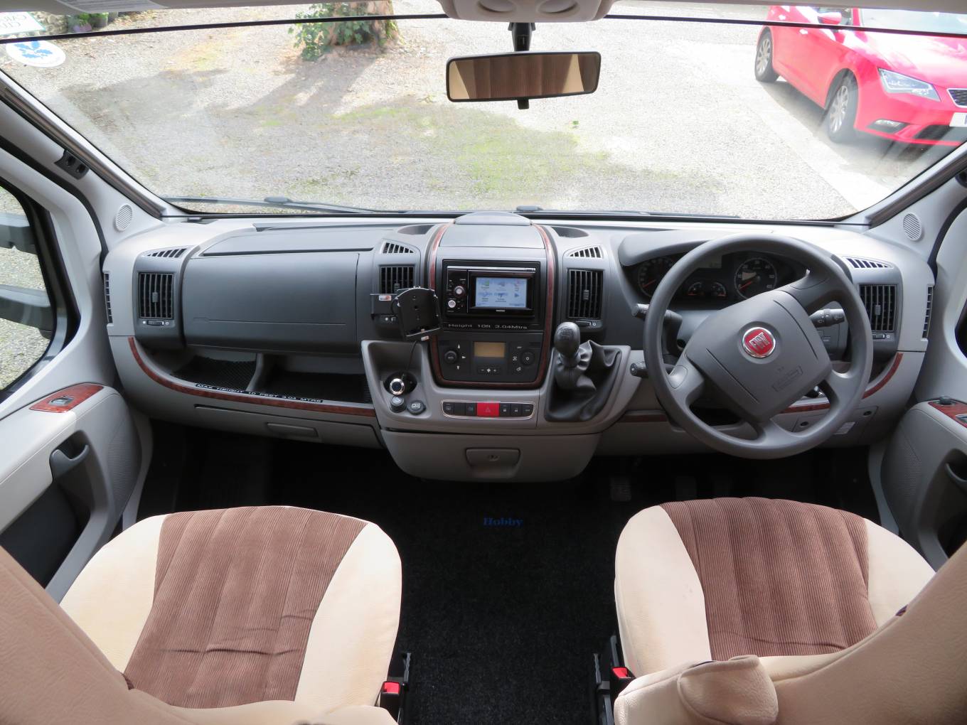 Inside the living area has all the quality and luxury you would expect from a Hobby, The living area is spacious with an extending swivel table which can comfortably seat up to 7 people. Above this is the electric drop down double bed which is accessed from a ladder, there are safety nets both sides to prevent you from falling out. The L shaped kitchen area is well equipped with a large fridge and separate freezer, a combined oven/grill, a 3 ring gas hob, a sunken sink and plenty of storage cupboards above and below. Opposite the kitchen is the large washroom which includes a cassette toilet, wash hand basin with storage below, a shower with circular sliding screens, two vanity cupboards with three mirrors in total and a circular dome roof-light. To the rear of the van is the large transverse double bed, this is accessed via two steps, there are two large windows and a roof-light giving a light and airy feel through the day time. Beneath the bed is a wardrobe with storage shelves to the side, continuing the theme throughout the van of plenty of storage.