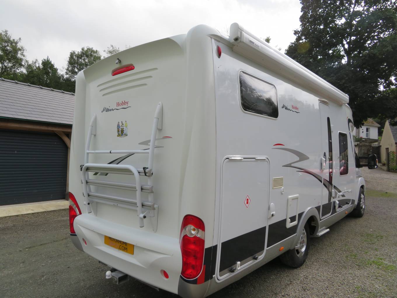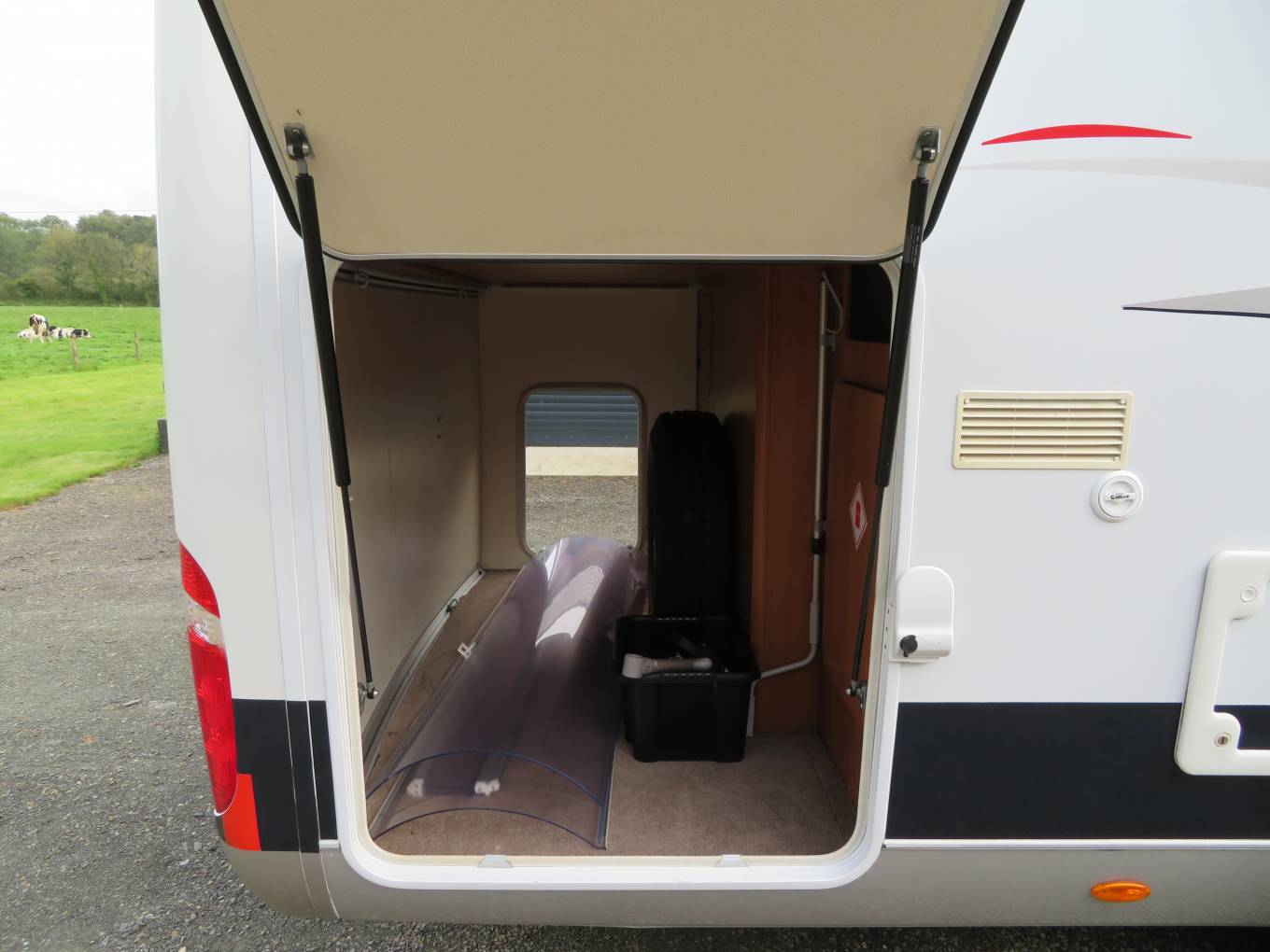 Externally there is a large garage to the rear, with an opening size of 840mm x 1015mm, there is a smaller door to the passengers side, three storage cupboards in the garage, along with the boiler and access to the both Gas-it bottles. There is a 3 bike, bike rack to the rear along with a tow bar. To the side is a Thule Omnistor side awning, Wind down rear steadies, two side lockers and an electric entry step.