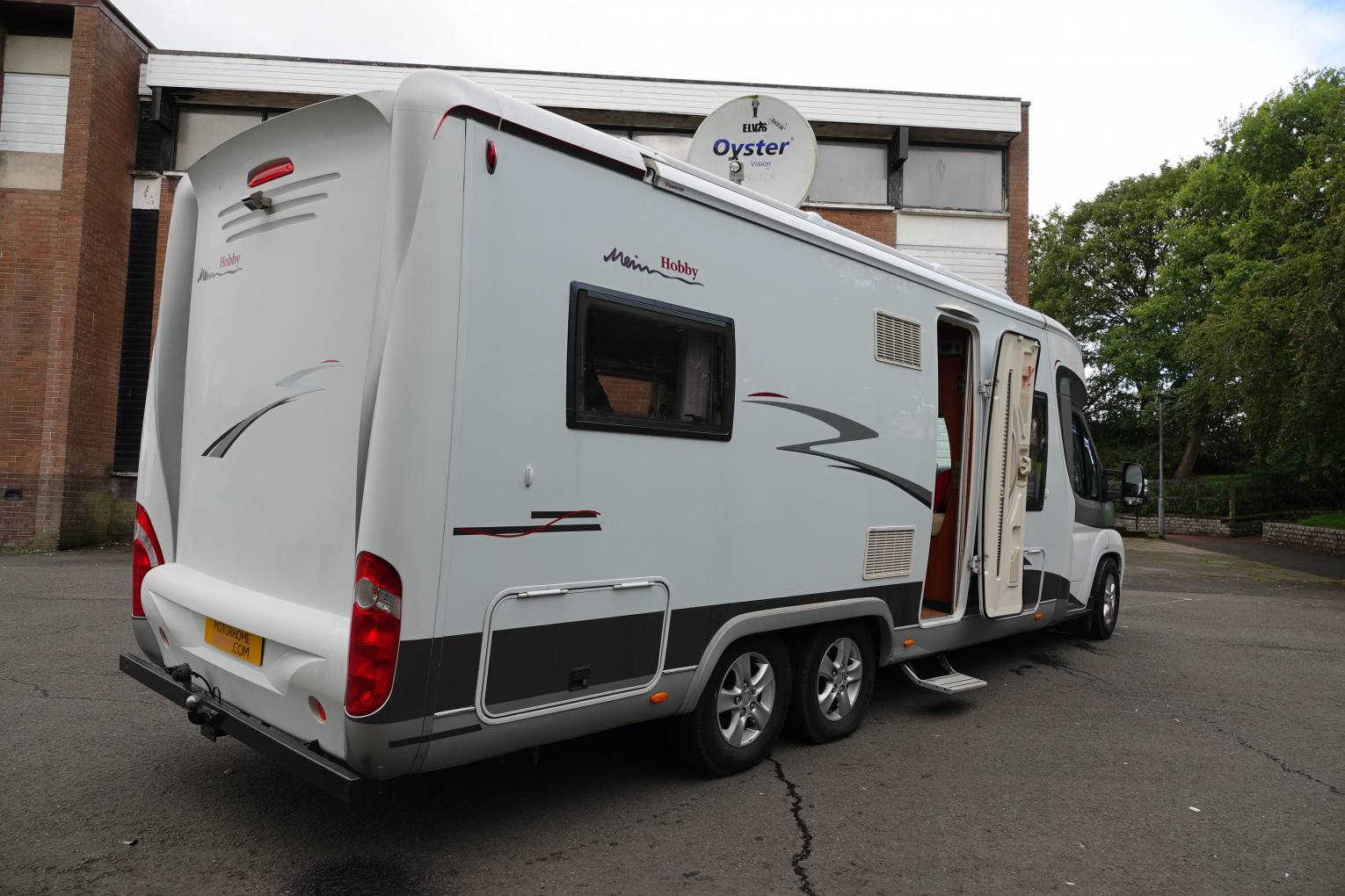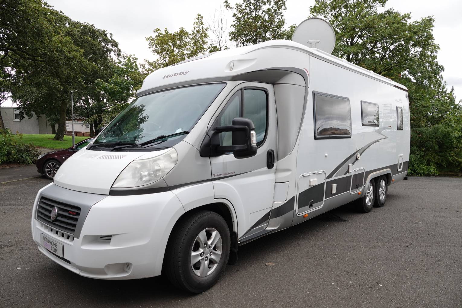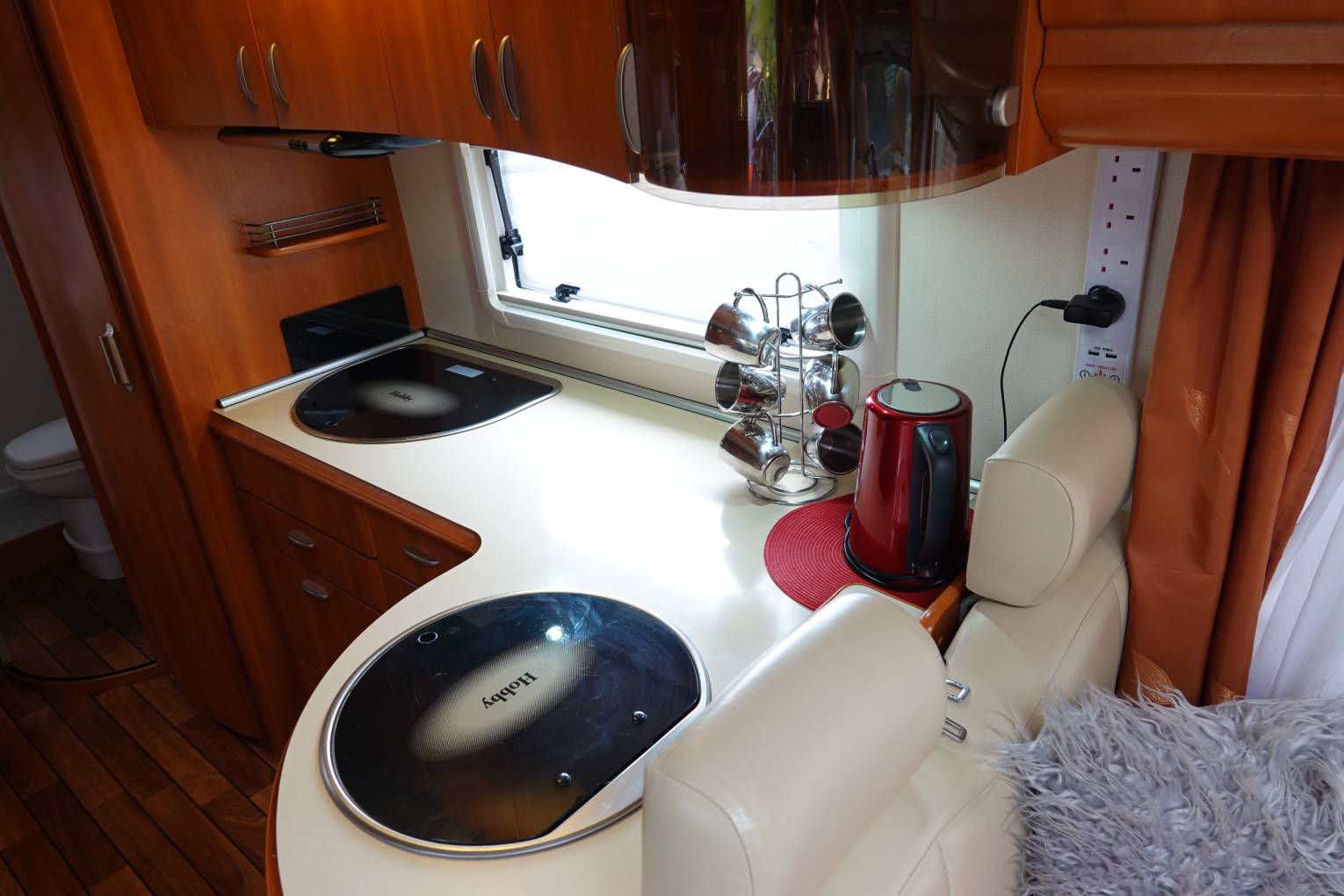 This is a 2008 Hobby Toskana 750 Deluxe edition, 4-berth, 4 forward facing travelling seats, low profile motorhome. It is based on a Fiat chassis and comes with a Fiat 3.0 litre engine complete with 6-speed manual gearbox. The cab features cruise control, air conditioning, leather upholstered swivel captain seats, cab blackout blinds and a reversing camera. The L-shaped lounge / dining area with matching leather side bench has a centre table that can swivel or be removed. The captain seats both swivel into the lounge to complete a lovely space with plenty of room for 6 or more people to eat or lounge comfortably. The lounge area converts into a further large double bed. The centre L-shaped kitchen area has plenty of space for prepping food etc and lots of storage above and below the worktops. Kitchen fittings include sink with mixer tap, 3 burner gas hob, gas oven and a large 3-way fridge with separate freezer. To the rear of the motorhome you will find a French bed again with lots of overhead storage and a large wardrobe. Adjacent to this is a spacious washroom complete with cassette toilet, sink and cupboard as well as a separate shower compartment.