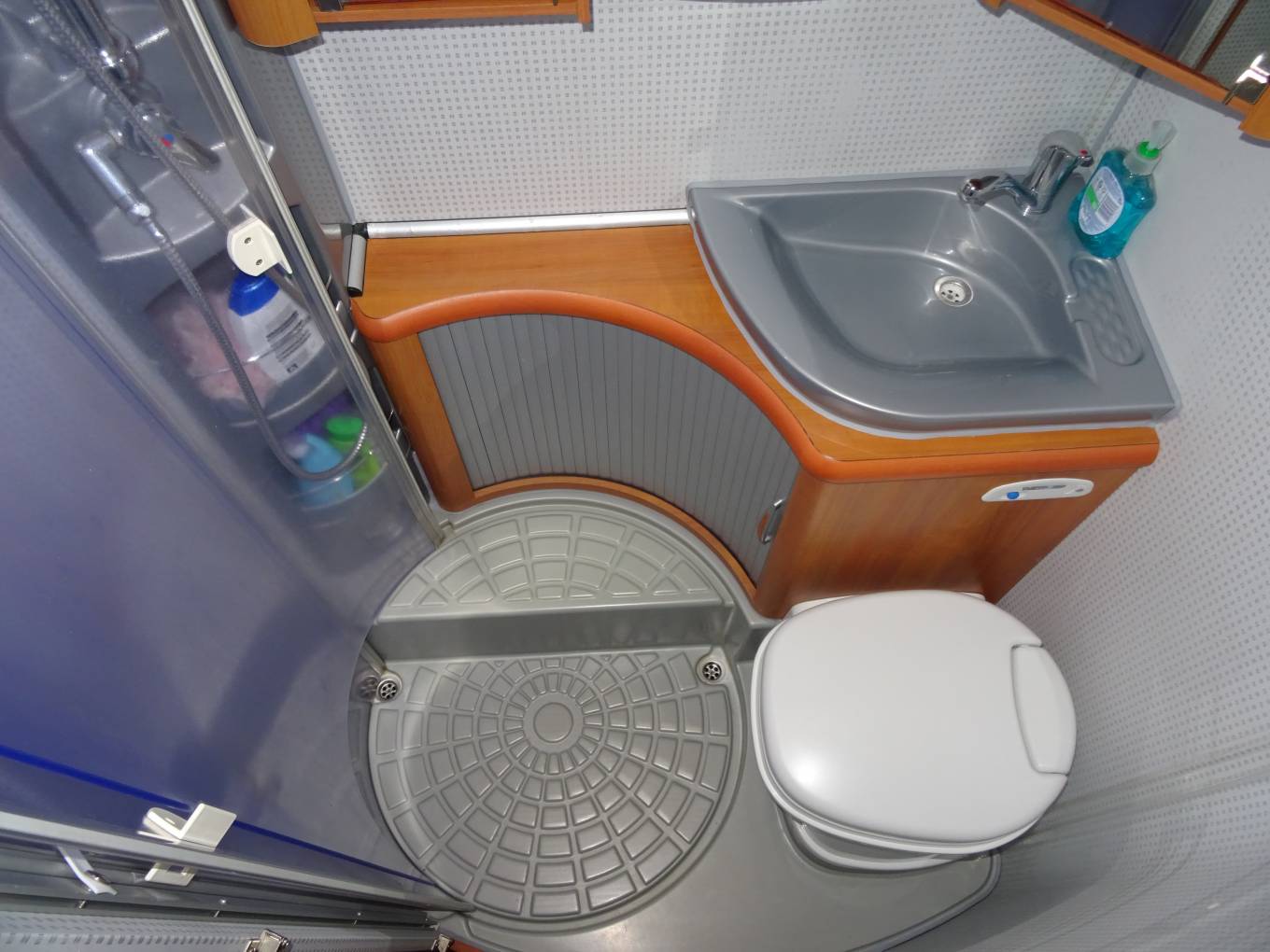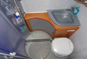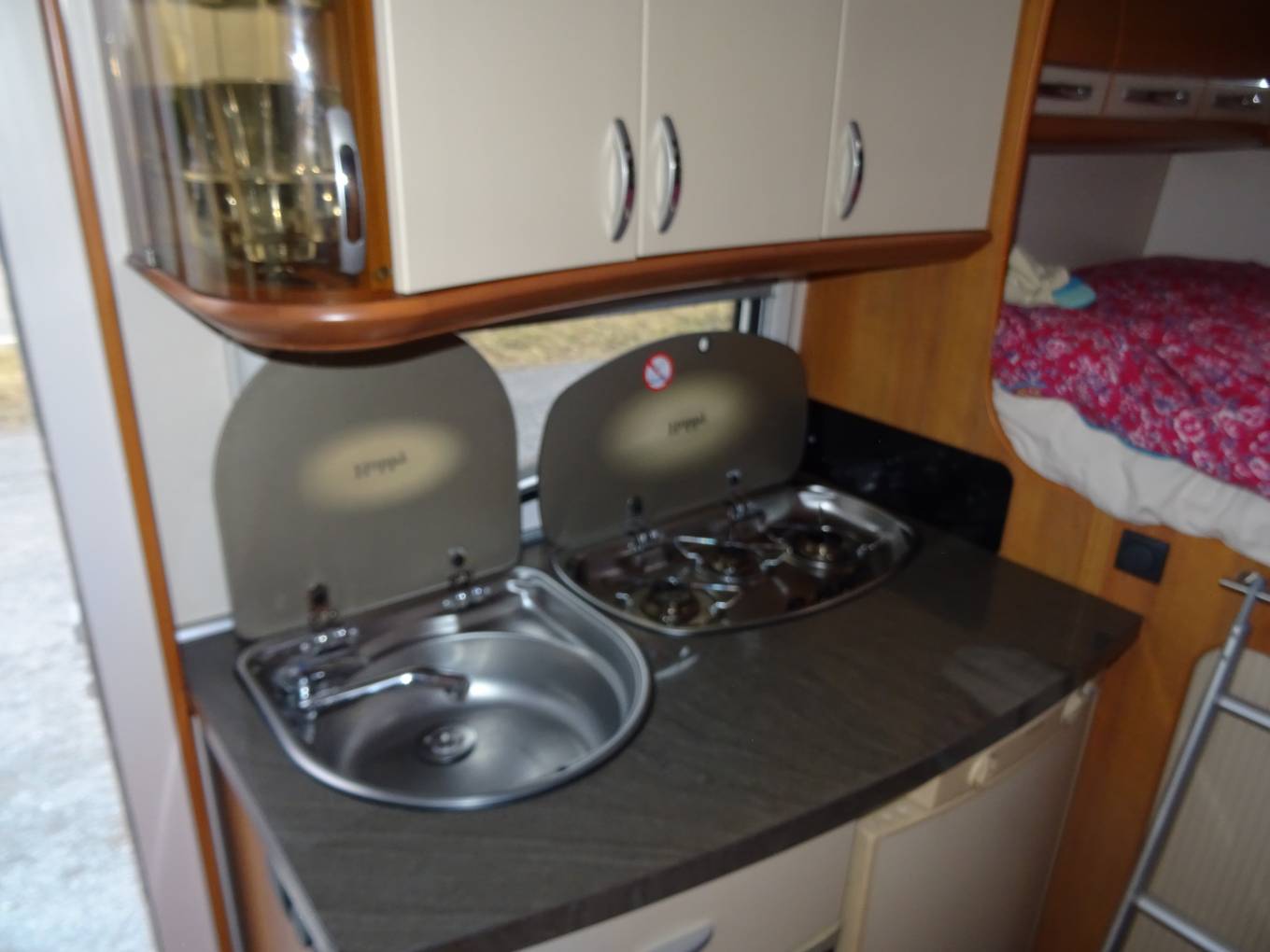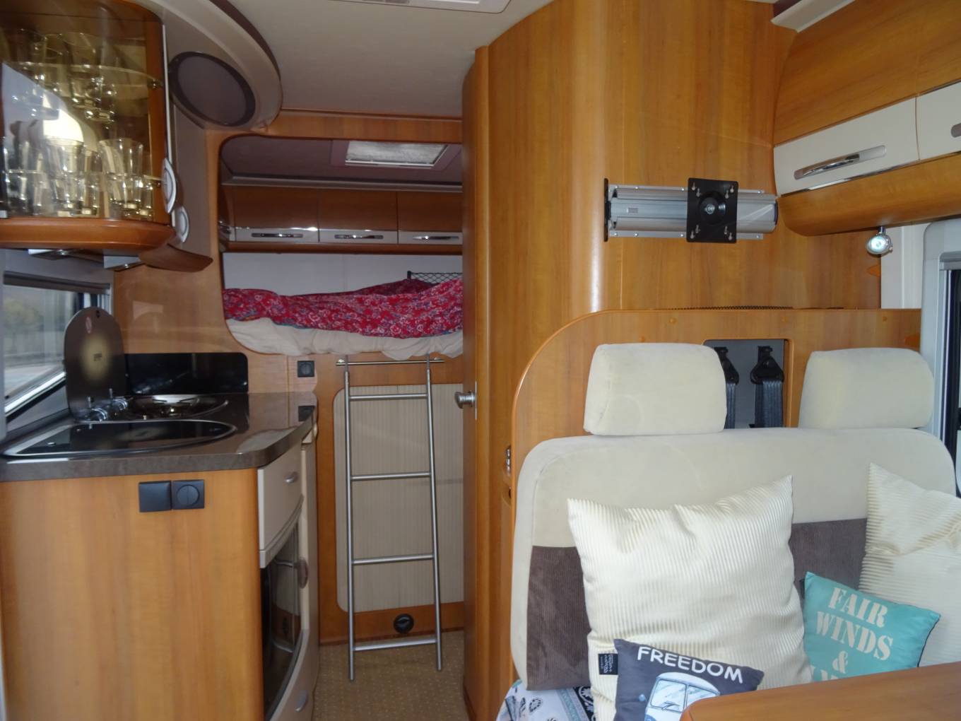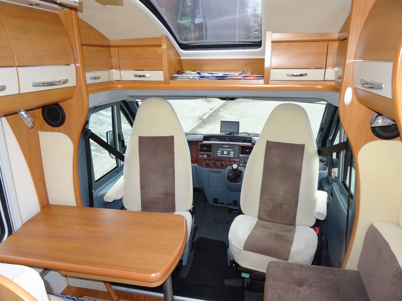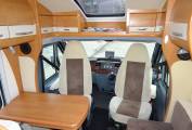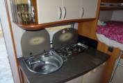 This Hobby Van has a lovely light interior, as you enter the habitation area you have the centre dinette/ lounge area with seat bench and chair, adjustable dining table and two captain swivel seats for additional seating area. By night this area can be made up to a full sized single bed.