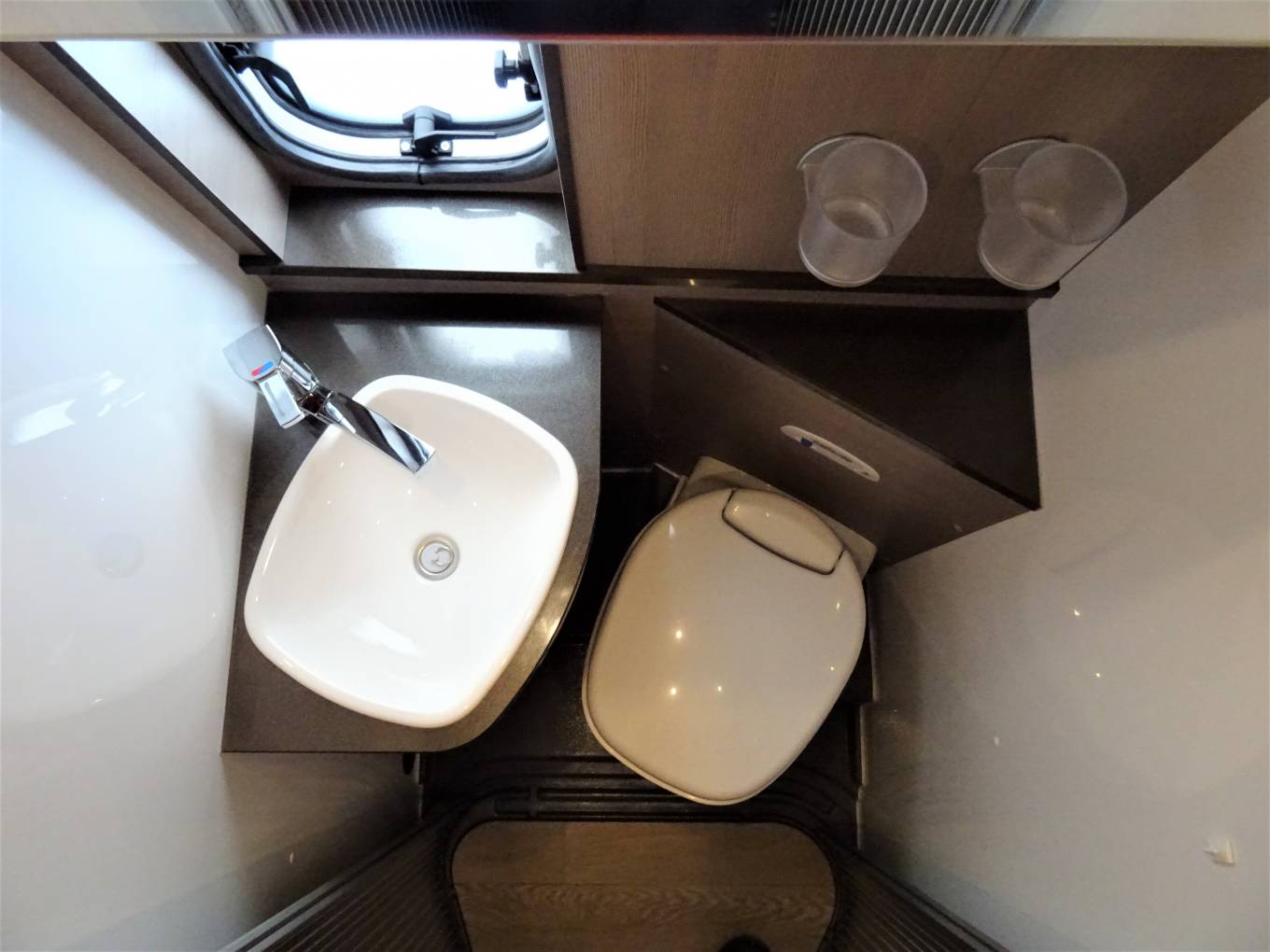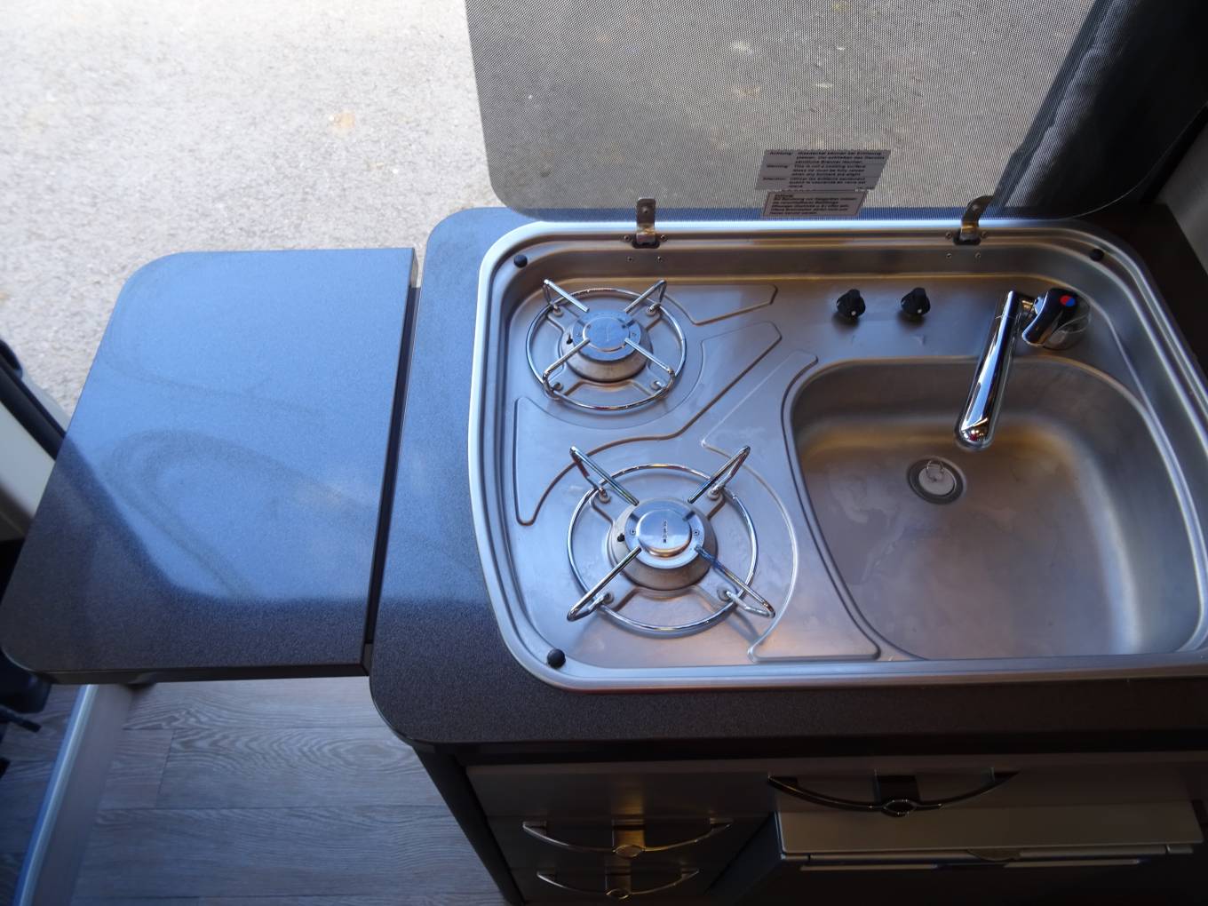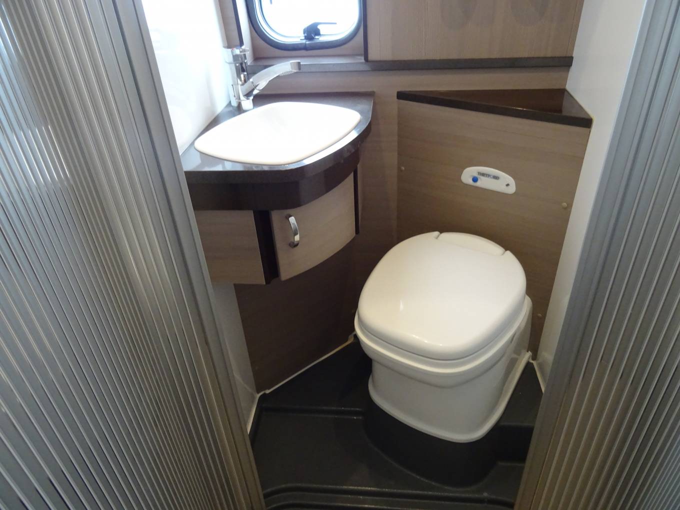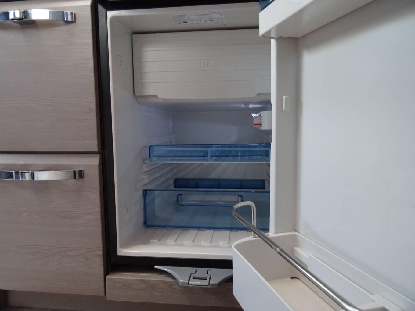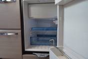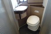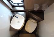 Midship the kitchen features a good array of soft close storage drawers, two burner hob, sink with mixer tap, side worksurface extension and fridge with freezer compartment . Adjacent to the kitchen is the immaculate washroom which features an ingenious shower enclosed by tambour doors, plus toilet and vanity sink. Onboard services include fresh and waste water tanks, Truma dual fuel heating and hot water. No space is wasted with lots of storage pockets and lockers, including an underfloor compartment in the dinette.