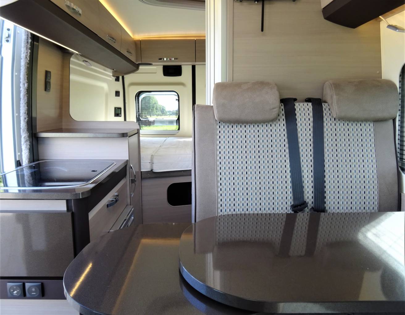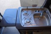 The Hobby Vantana 55 packs one of the most popular layouts found on larger motorhomes into a 5.5 metre van conversion. There are three clearly defined zones, with the lounging space at the front, kitchen in the centre with washroom adjacent and to the rear a fixed double bed area. Its a tried and trusted setup, nicely executed and adaptable for two or more thanks to four seatbelts and an occasional bed available from the forward dinette, which can seat four for a social gathering.