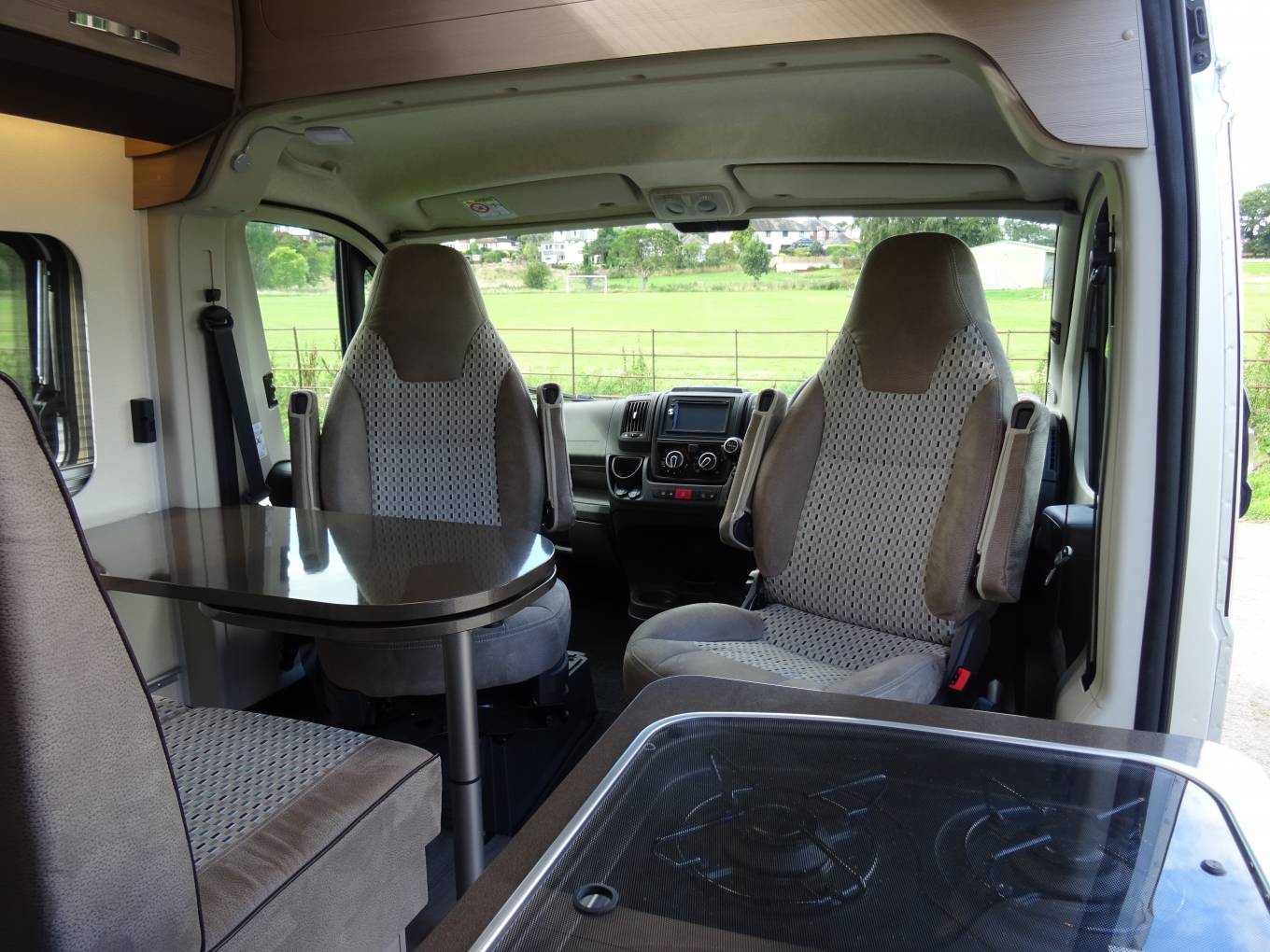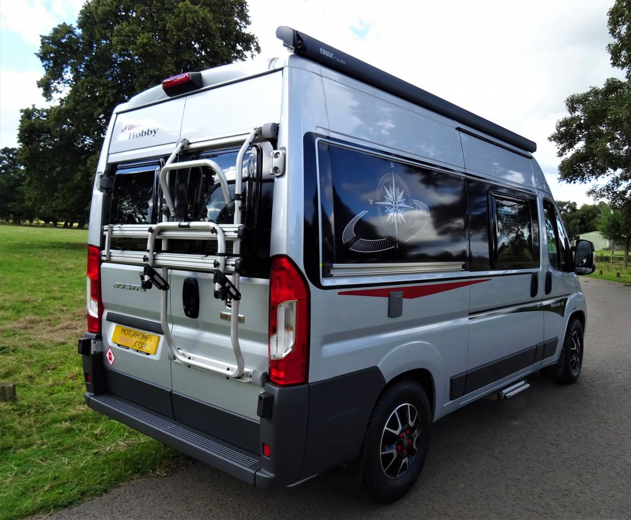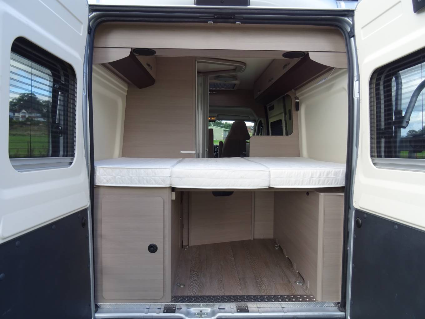There are many extras including integrated blinds and fly screens throughout including rear door windows, Electric step, Wind-out canopy, Bike Rack and while in the cab there is air conditioning, cruise control, central locking, reversing camera and Sat Nav.